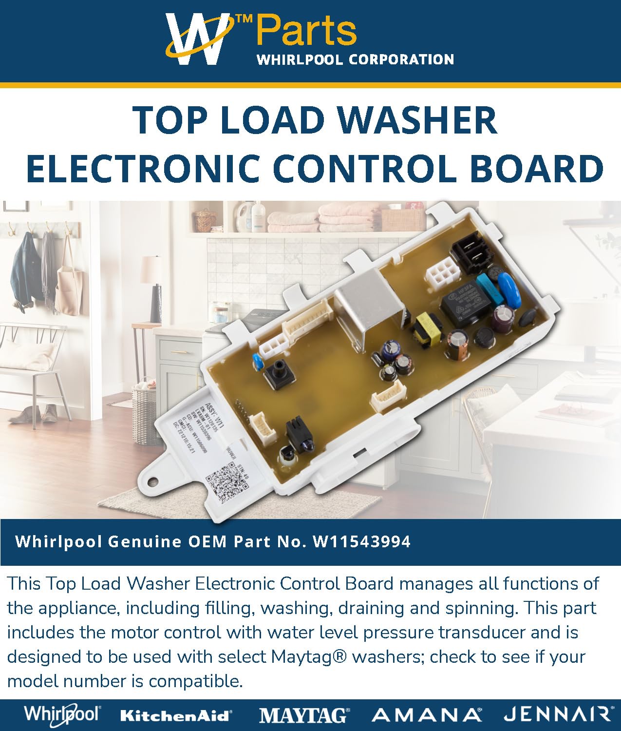 REPLACEMENT PART NUMBERS:W11543994 Top Load Washer Electronic Control Board replaces the part number W11284145, W11419173, W11479877, W11498803, and W11538088