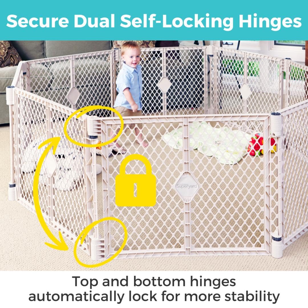 ADJUSTABLE & FLEXIBLE - Adjust our toddler playpen to fit your space. The hinges move independently for angled or straight setups. Using a maximum of 6 panels, the play yard can act as an extra-wide baby gate with the Superyard Wall Mount Kit (sold separately).