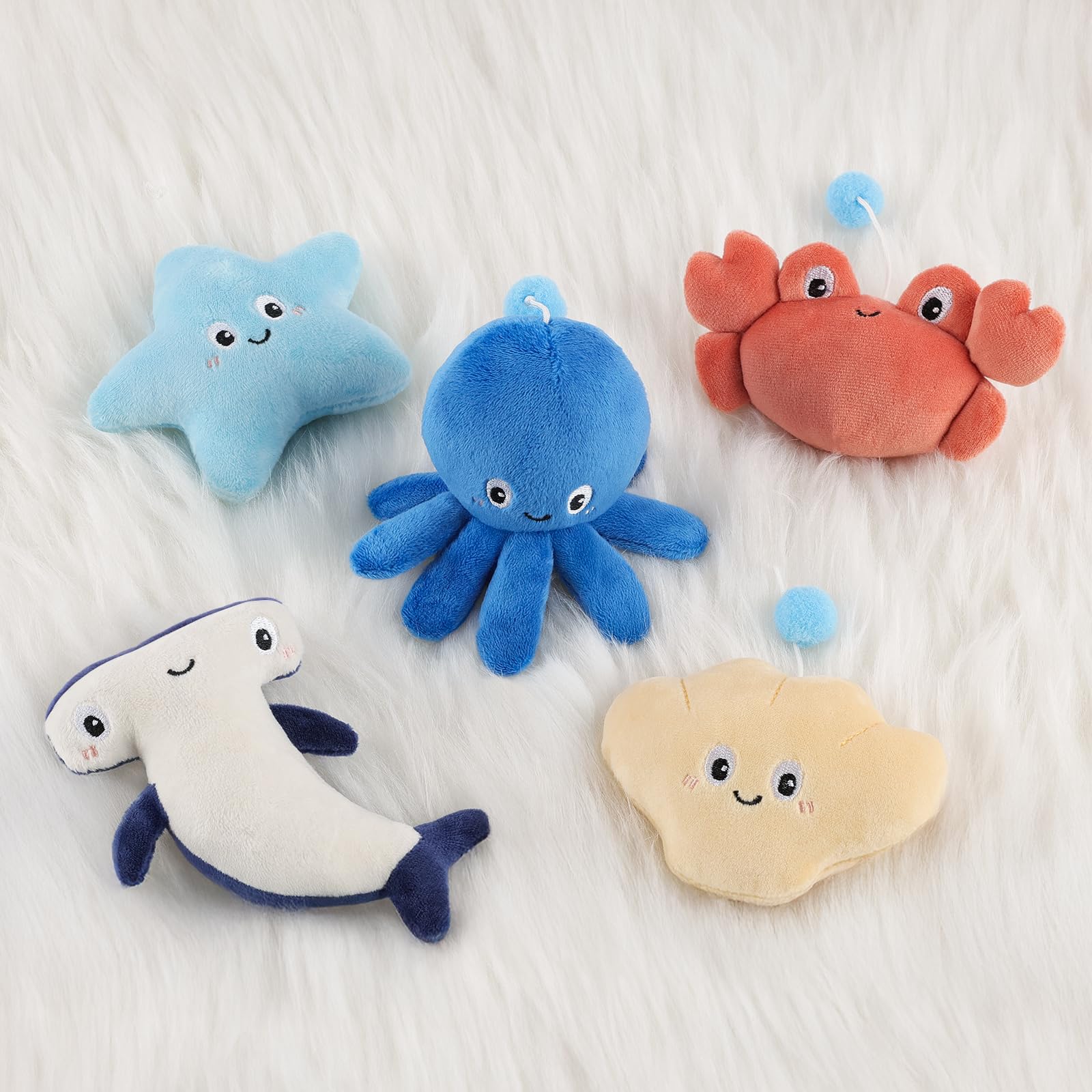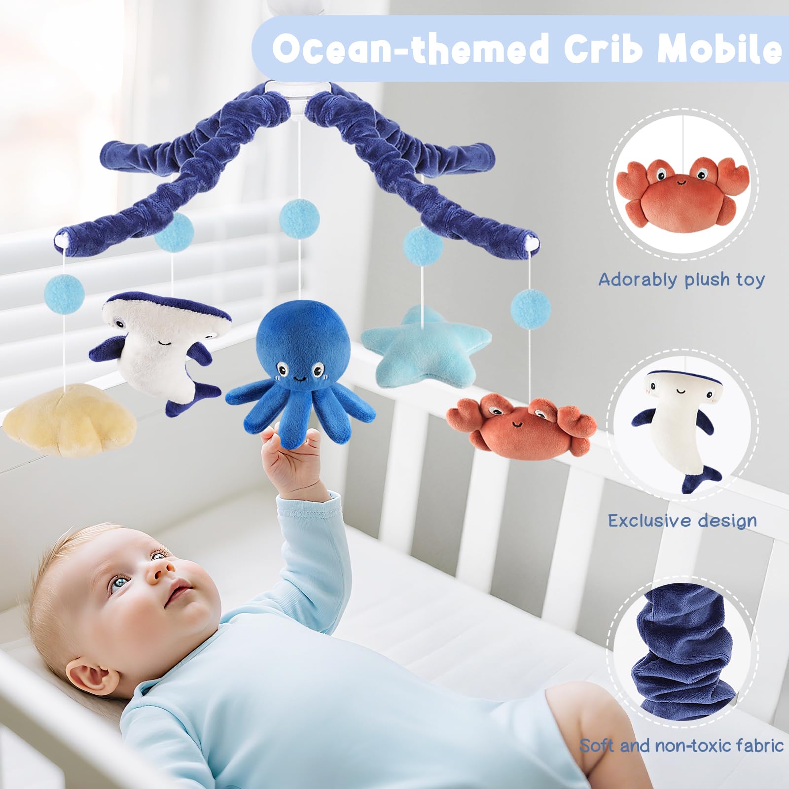 Charming Design: Dive into a world of wonder with this ocean-themed crib mobile, featuring a cuddly octopus, hammerhead shark, crab, seashell, and starfish. Gently swaying above, these soft sea friends bring comfort, curiosity, and a sense of calm—creating a peaceful underwater escape where your baby can dream and grow