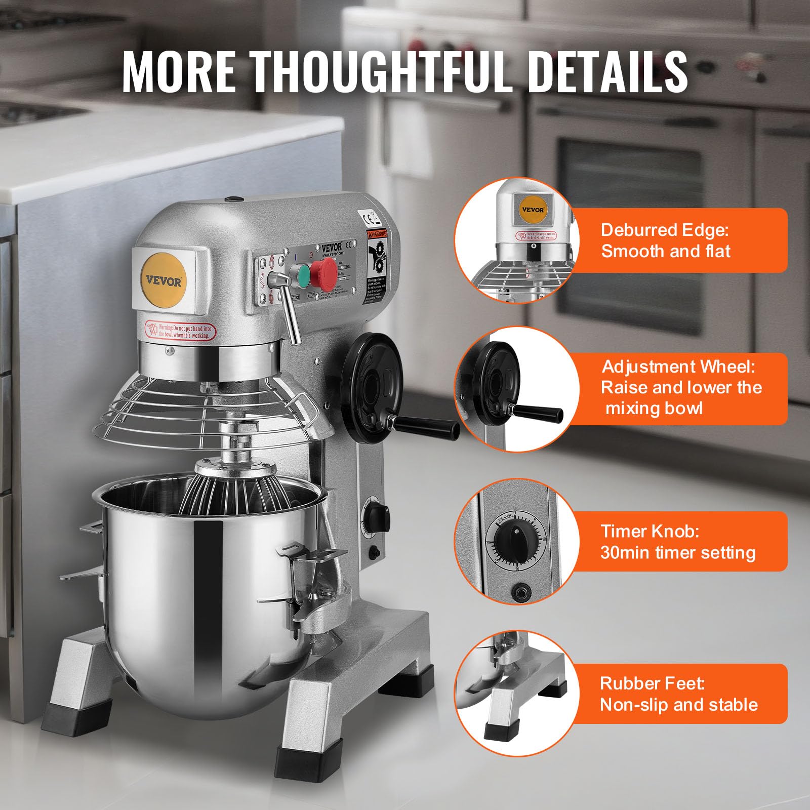 Innovative Timer Function: This mixer has an upgraded timer knob, which enables you to set up mixing time within 30 minutes. This timer function eliminates the need to keep checking the mixing process beside the machine. In addition, it adopts a turning wheel to lower or raise the bowl. With the detachable bowl & stirrer, it’s easy for you to clean. The secure shield is designed for keeping hands from injury, while the machine will automatically shut down once the shield isn't tightly closed.