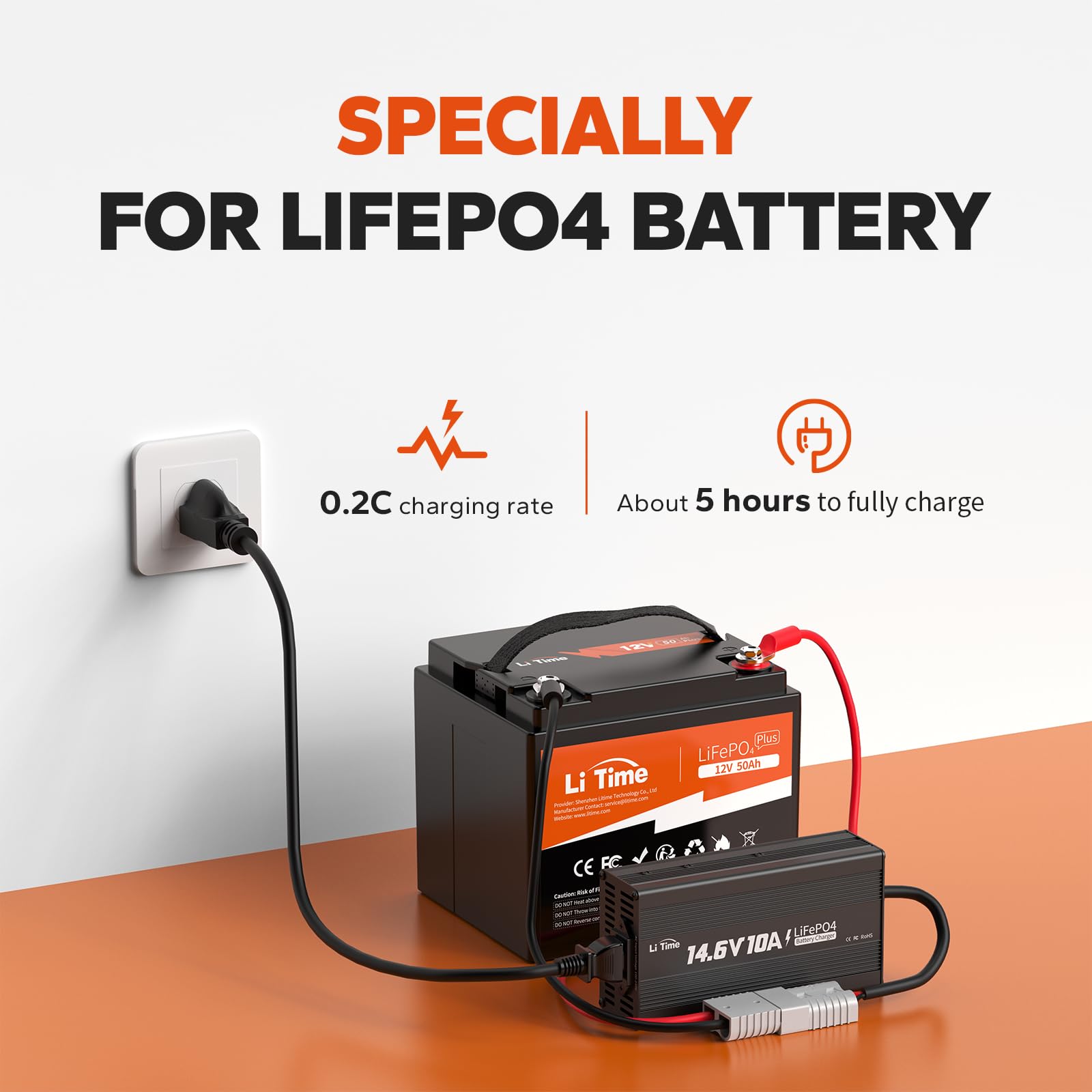 14.6V 10A Dedicated Charger: LiTime 14.6V 10A Lithium Battery Charger is dedicated for 12V(12.8V) 50Ah LiFePO4 battery. And 12V 50Ah lithium battery can be efficiently charged by 14.6V 10A LiFePO4 battery charger in around 5 hours from 0% to 100% capacity. 14.6V 10A LiFePO4 battery charger offers very consistent and smooth output voltage extending the life of the battery.