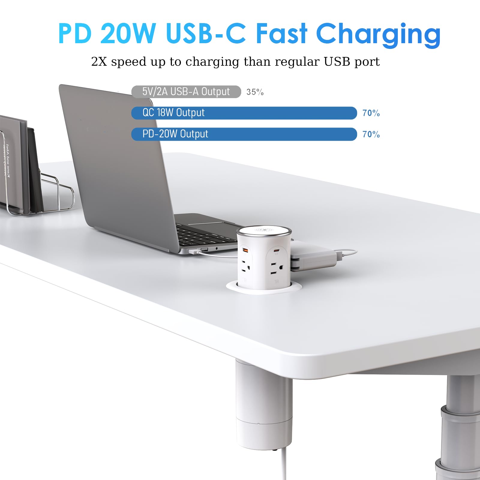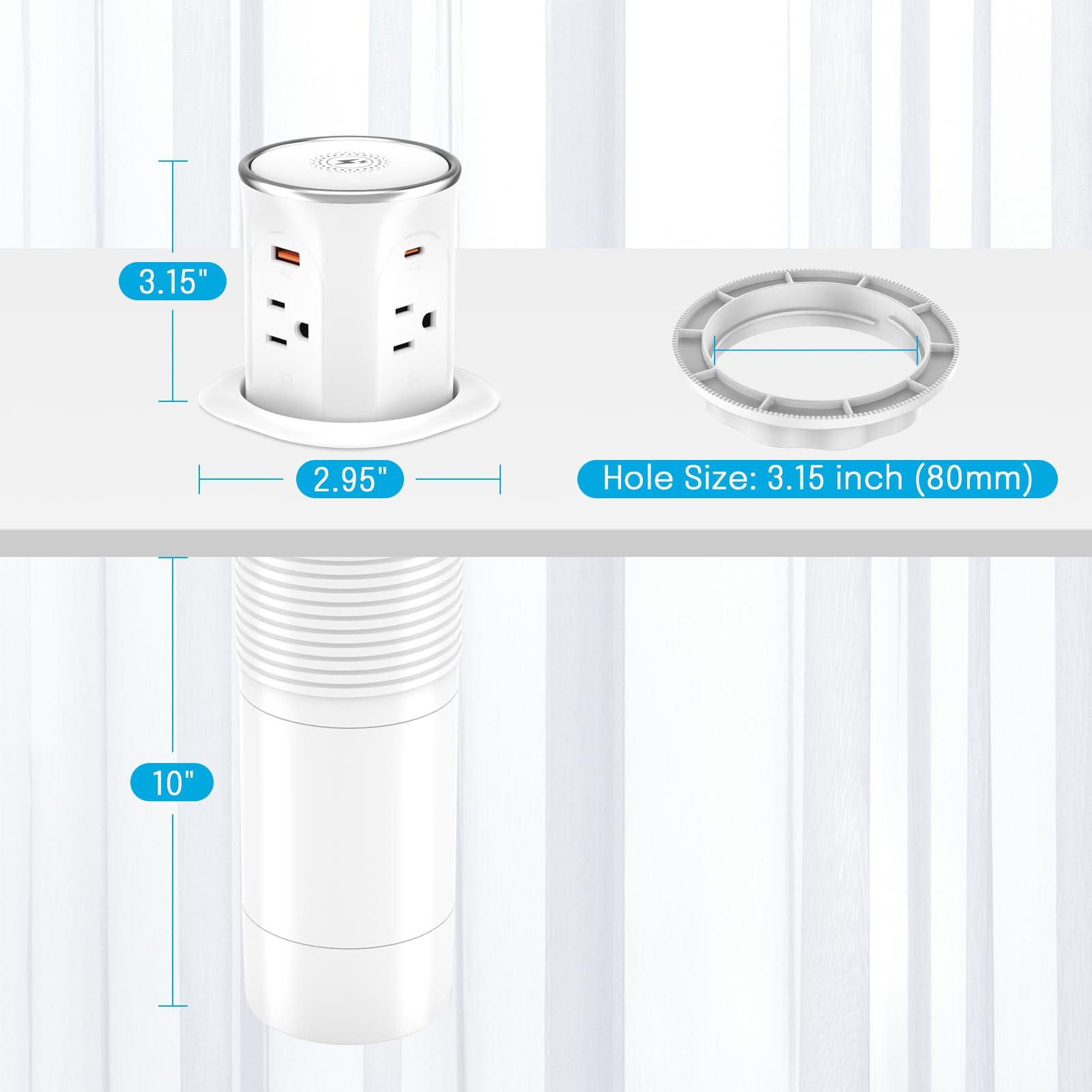 【Easy Installation】HEZI pop up outlet fits 3.15-inch (80mm) desk hole size, built-in spring-loaded pop-up mechanism, that's just simply press in the top to pop the unit up for use. perfect for your home, kitchen island, office, meeting room, RV.