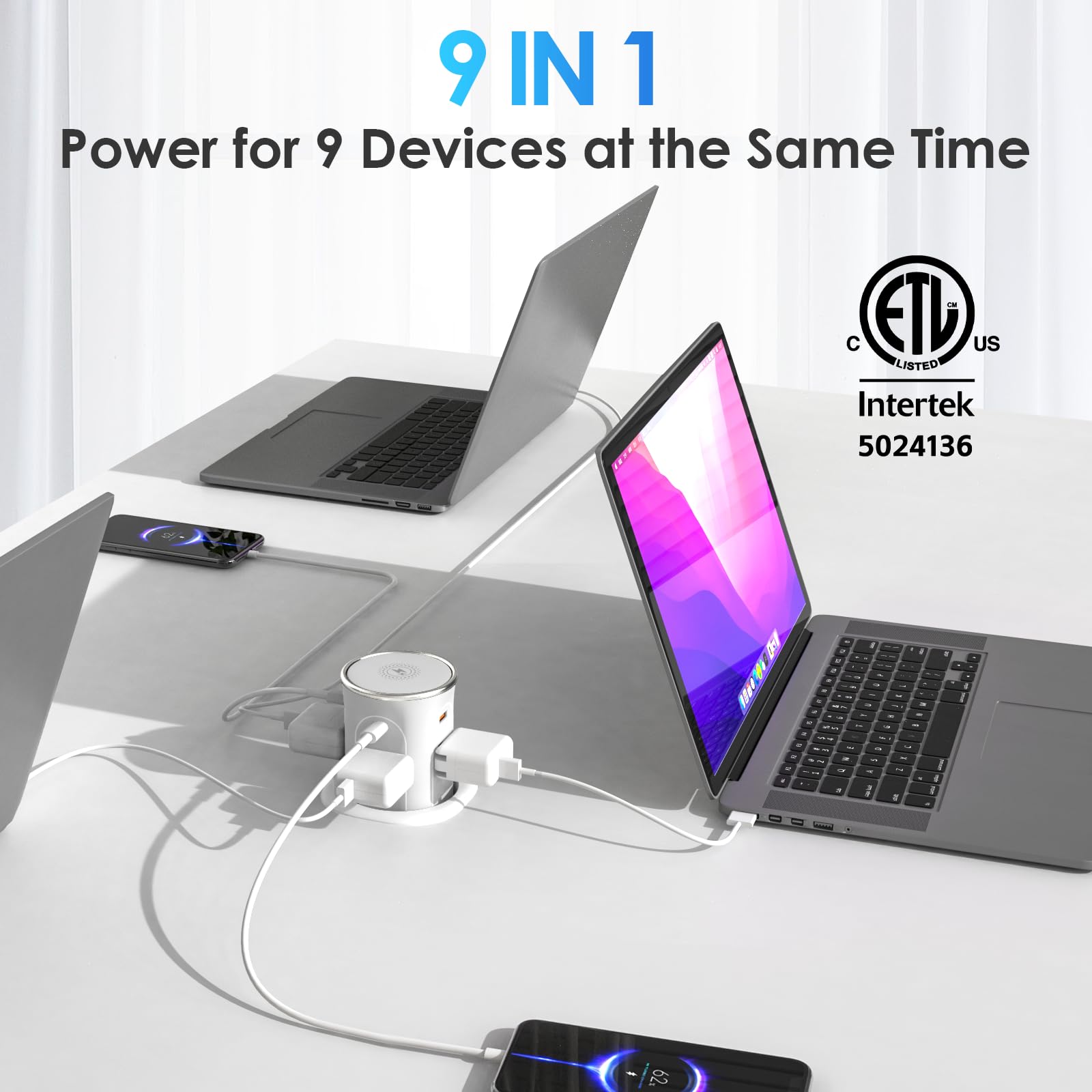 【Charge Up to 9 Devices】4-sided surround design for easy access to the power outlet. 4 AC outlets (TR), 2 USB-C ports, 2 USB-A ports,1* wireless charger panel provide multiple charging options at the same time.