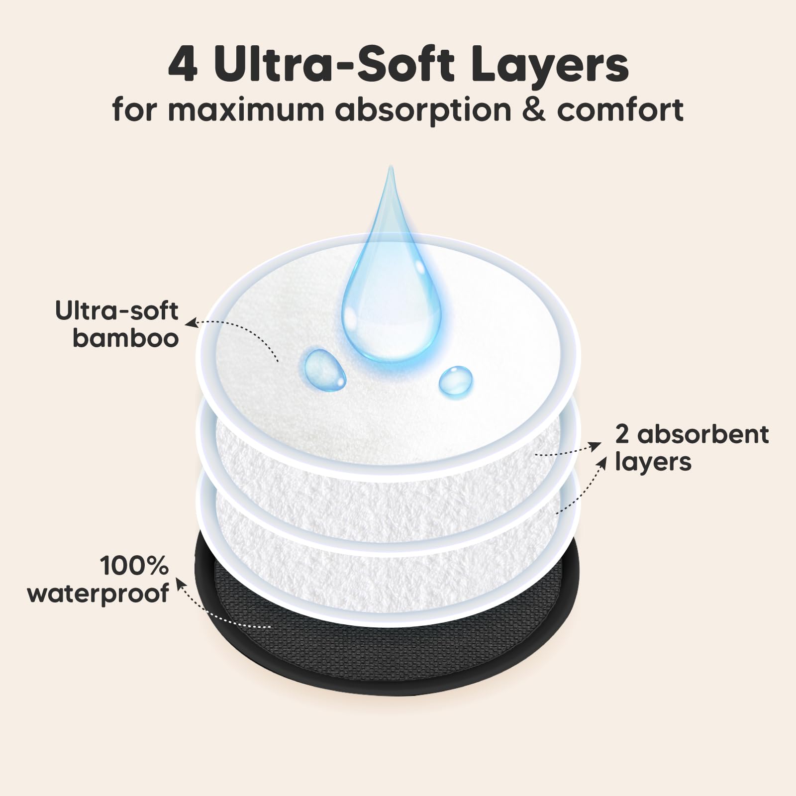 Great For Leakages – Leakage is a thing of the past with our 4-layer nursing pads. KeaBabies Nursing Pads feature three layers of ultra-absorbent viscose derived from bamboo, sealed with a protective waterproof outer layer for extra security on the nipple pads. Tip: If you experience a heavy flow, please replace breast pads every 5-6 hours.