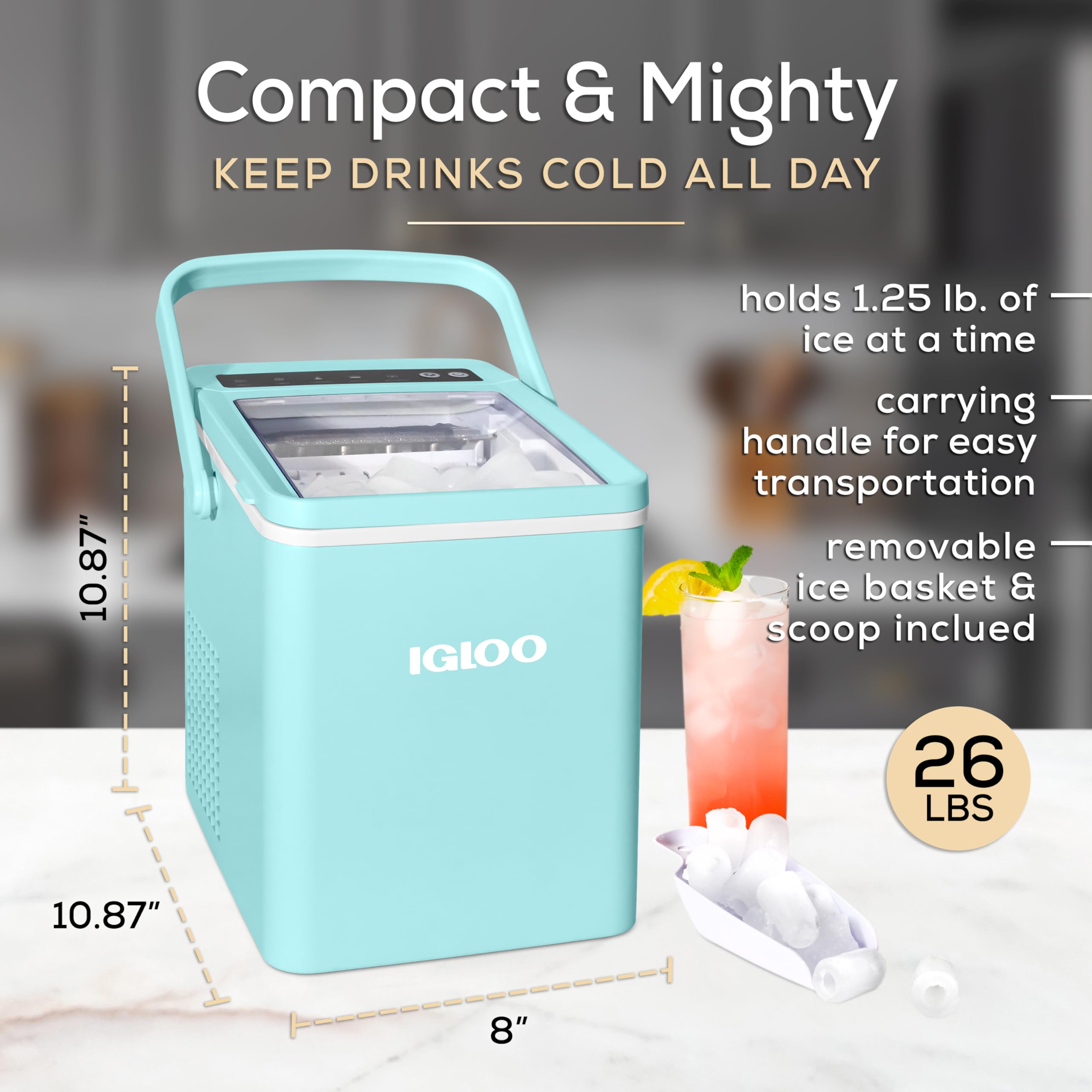 Say hello to this perfectly compact, stylish and portable appliance that will keep your beverages nice and chilled! With the ability to make ice in as little as 7 minutes, this unit has the capability to produce 26 pounds of ice per day. Comes with an easy carry-handle, allowing you to bring the ice maker from room to room. A viewing window allows you watch the ice being made, while the 1.25-pound ice basket ensures plenty of capacity for all of your beverage needs. The automatic five-cycle self-cleaning function makes clean up easy and allows clean ice to be made every time. The LED-lighted control panel lets you to choose from small or large ice cube sizes, while also letting you know when to add water and if the ice basket is full. Perfect for pool parties, home bars, dorm rooms, offices and more! Cold Drinks. Warm Smiles.