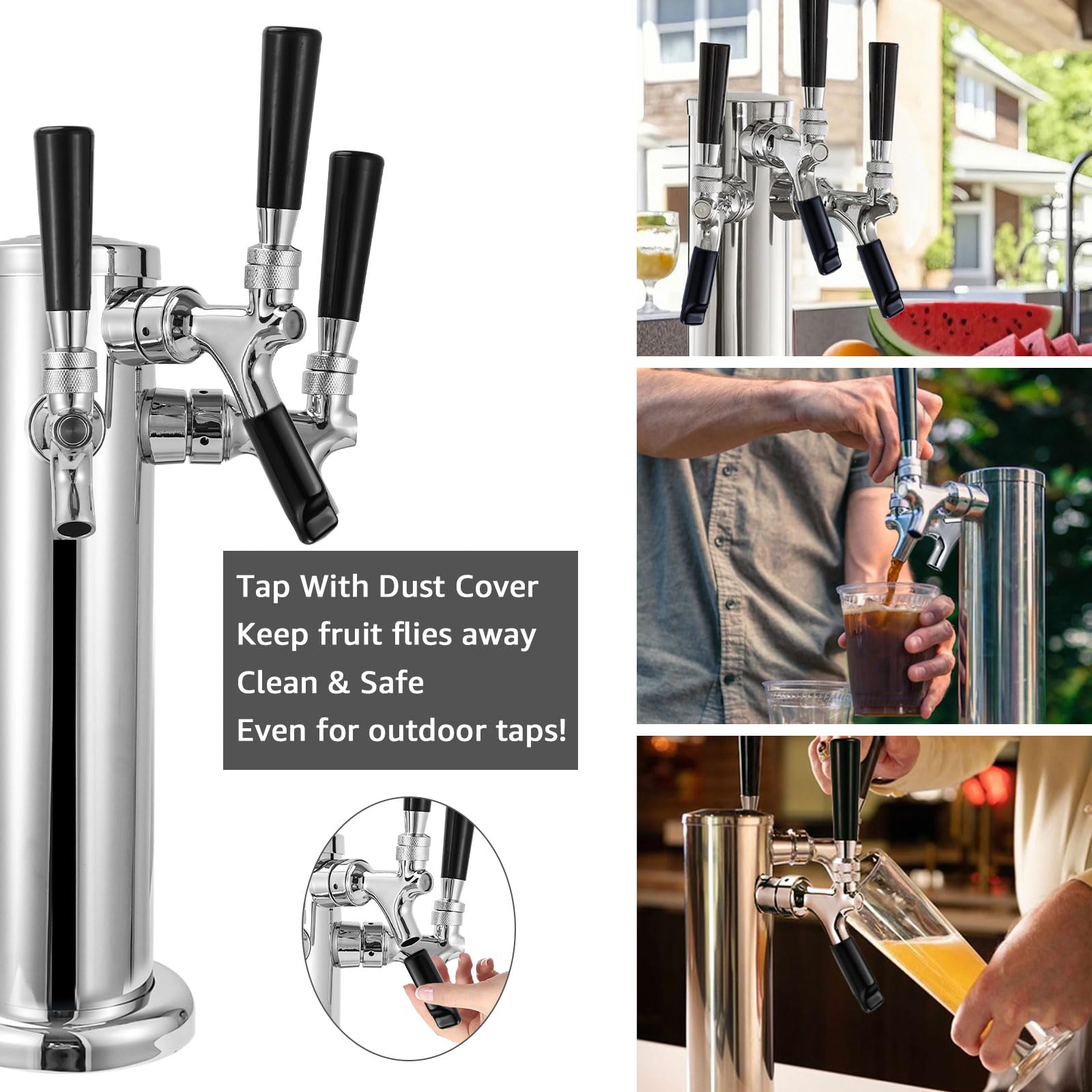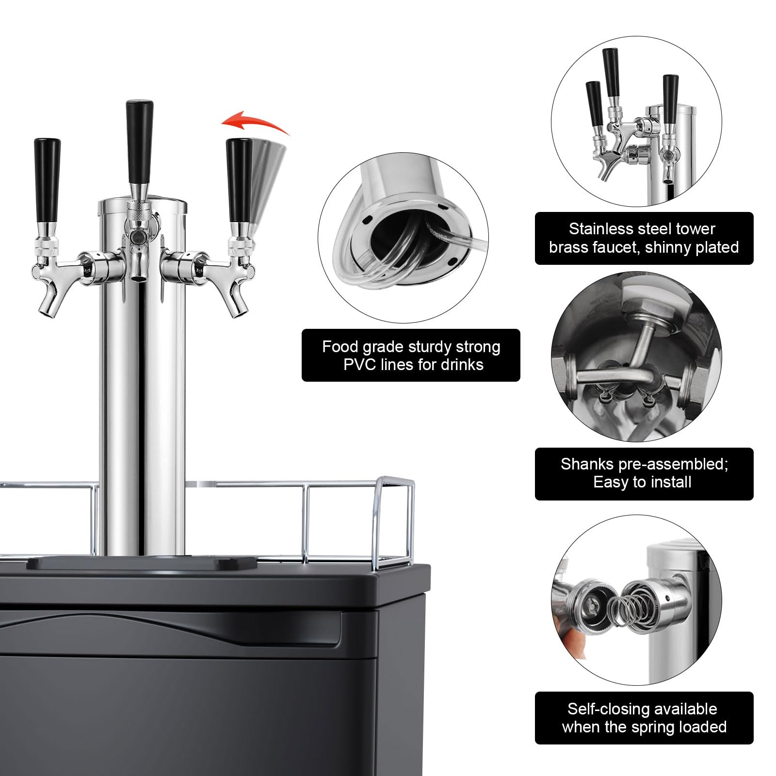 New Upgraded Triple Beer Tower: Compared to single/double beer tap kegerator tower , 3 tap kegerator tap kit allow you to enjoy 3 drinks at once or speed up dispensing to meet your various needs. Improved self closing springs and continuously improving. Package includes 2 springs for installation of self-closing faucets. The springs are so strong that one hand may be needed for installation. The self closing faucet is the end of dripping