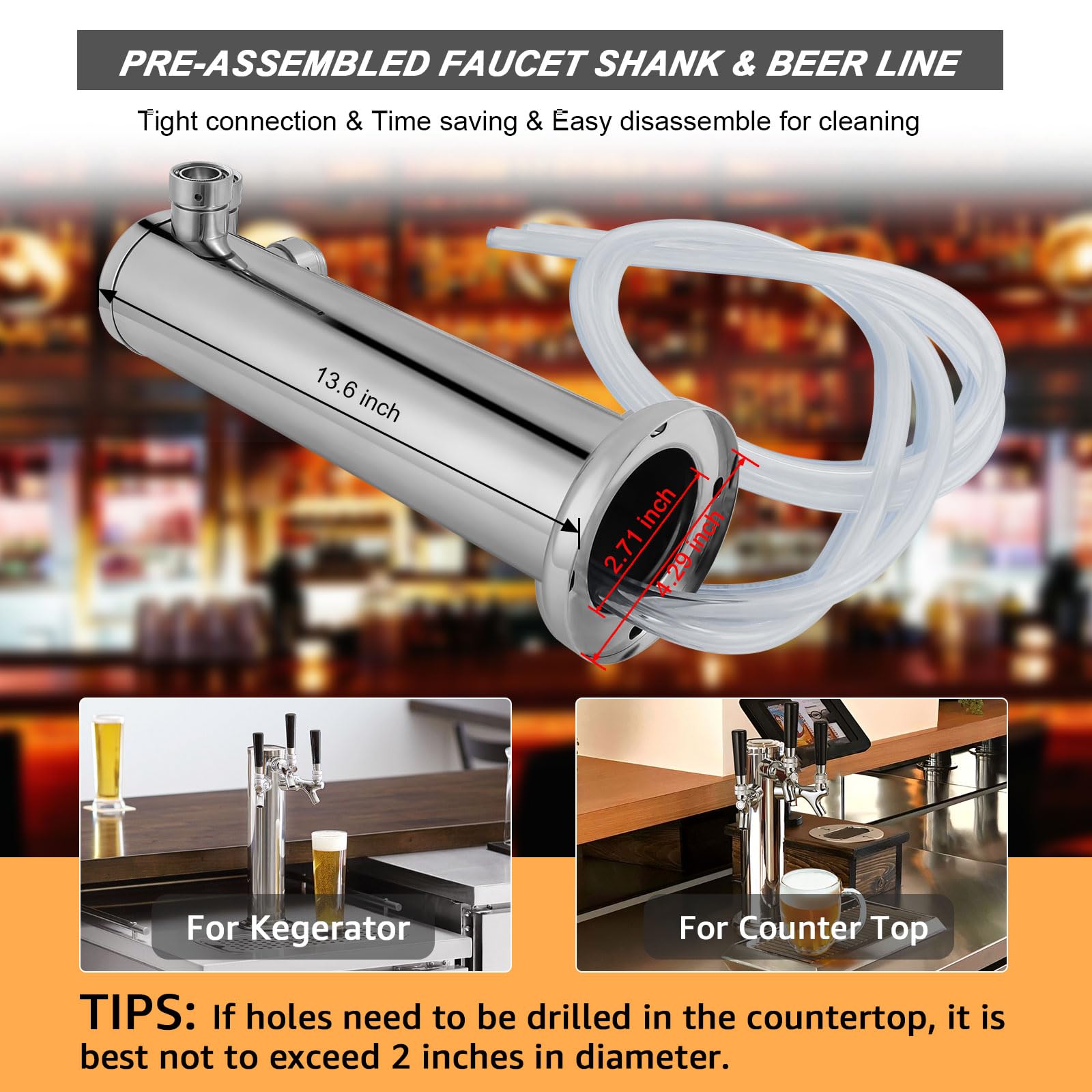Few Minutes for Easy Installation Convenient Kegerator Parts Kit: Pre-assembled faucet shanks and beer lines to save you time. 1. install this on a bar counter: drill holes on the countertop for tubing and screws, place the gasket, pass the tubing through the hole, use screws to fix the tower, and install the faucet. 2. Install on a kegerator would be easier: use the m5/m6 screws to fix the tower directly, no drills are needed