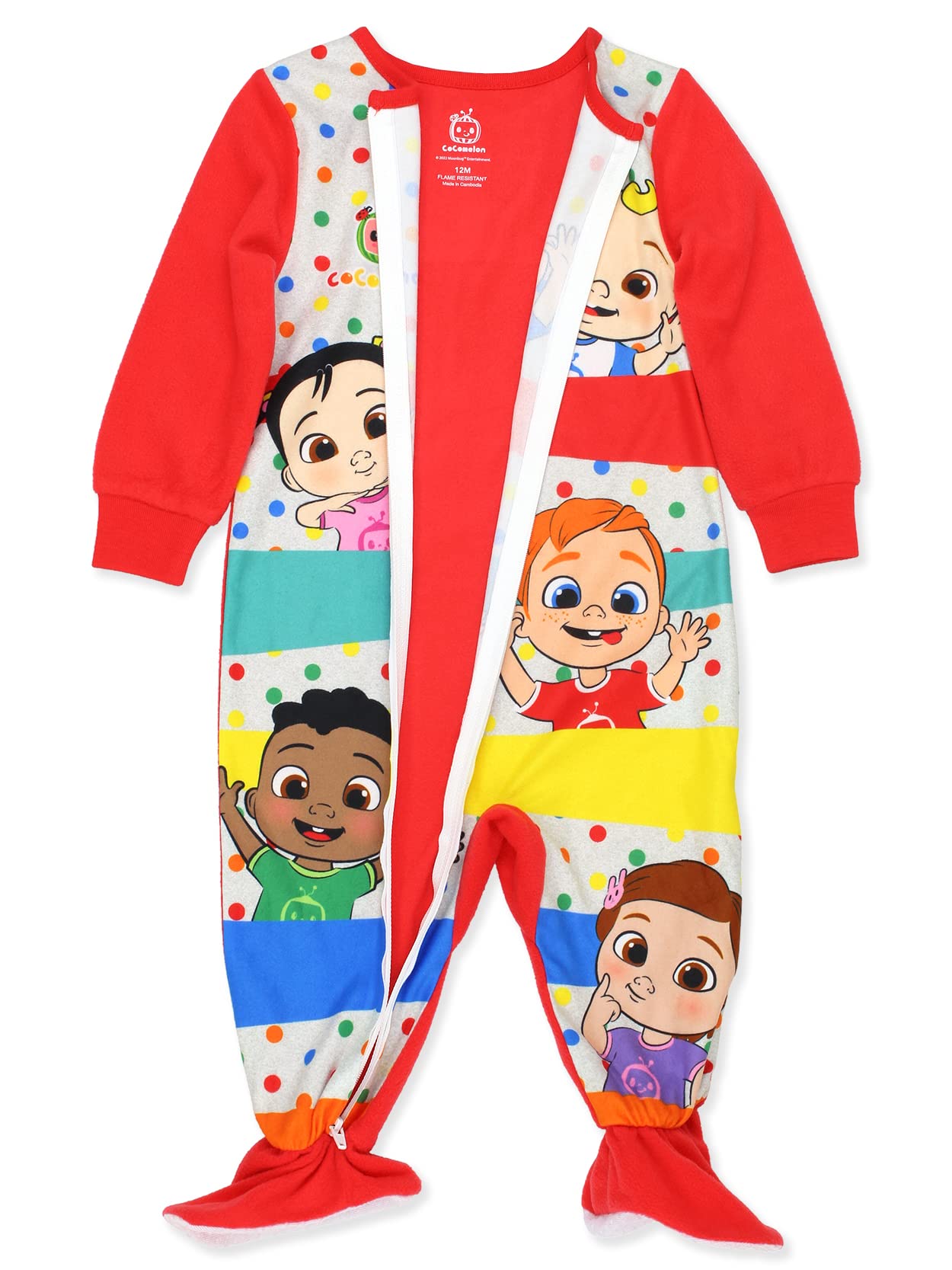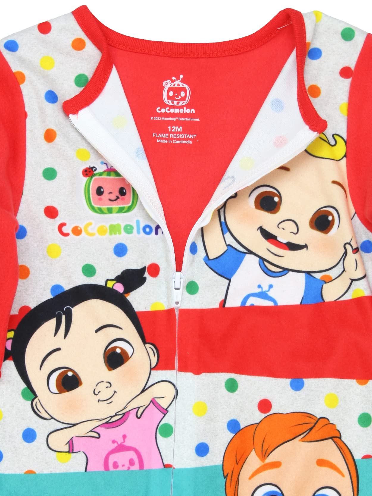 Description Get ready for bed with this comfortable infant and toddler boy's and girl's Cocomelon footed sleeper pajama! Dressing for bed becomes less of a chore and more like play with these cute one-piece pajamas! Each blanket sleeper pj features your favorite Cocomelon characters: JJ, Cece, Nico, Cody, and Nina! Each pj features a full front zipper closure, sublimated graphics, and long sleeves in a warm micro-fleece fabric. This footed pajama set contains textured non-slip soles. It's the perfect sleepwear choice for any Cocomelon fan! Available in infant sizes 12M, 18M and 24M and toddler sizes 2T, 3T, 4T and 5T.