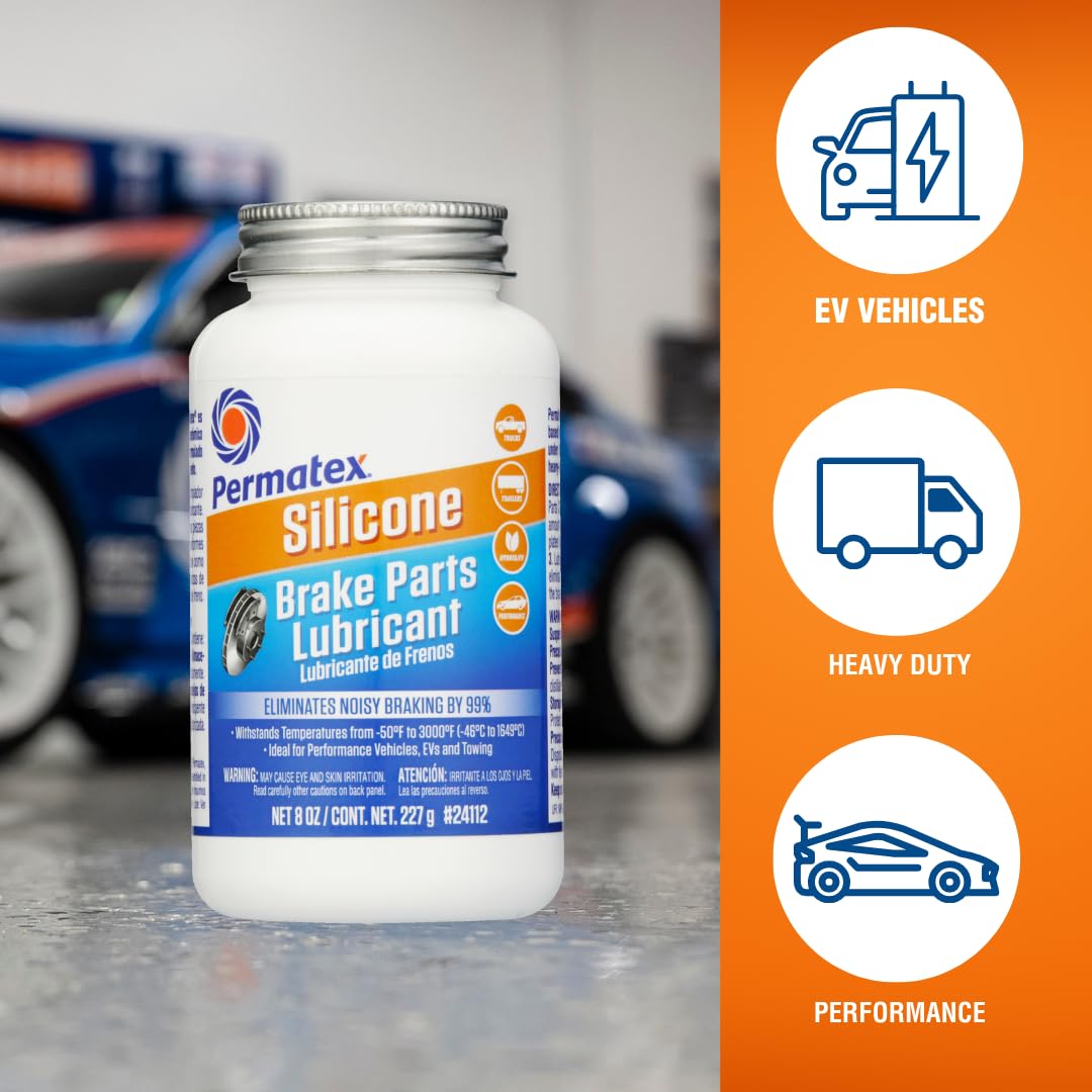Permatex Silicone Brake Parts Lubricant is a NEW, award winning, formulation that is fortified with ceramic solids to reduce noisy stops by 99%. The Silicone Brake Parts Lubricant is the premium brake parts lubricant in the Permatex brake parts lubricant portfolio that is ideal for heavy duty, performance vehicles, and EV's.