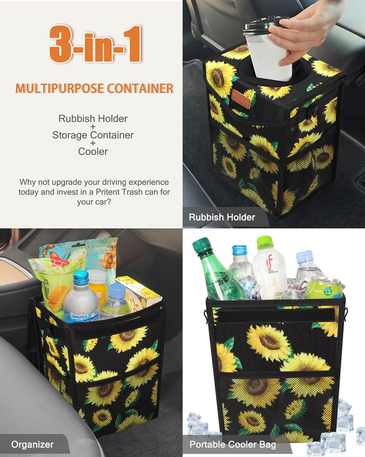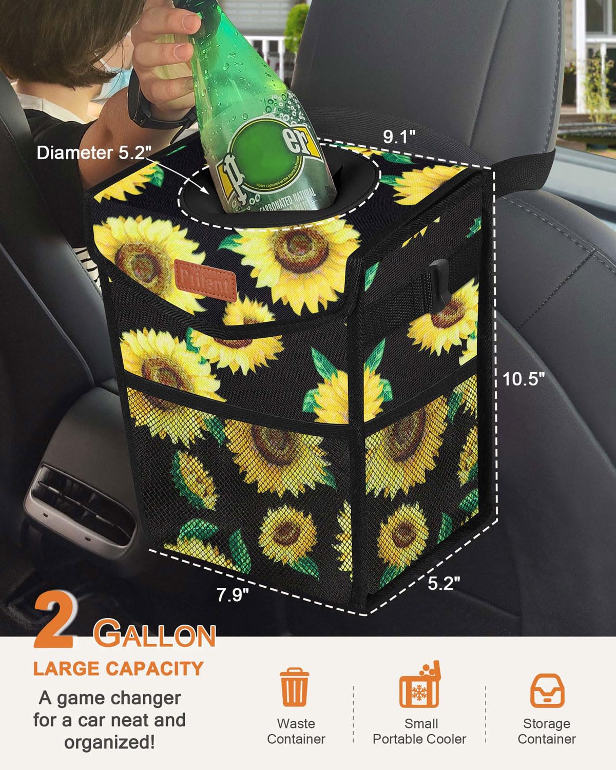 3-in-1 Multipurpose Container With 2 gallon Capacity:A game changer for a car neat and organized! It is not only a rubbish holder and car storage organizer, but a nice portable cooler bag for your car. Mesh pockets provide convenient storage places for things like tissues, extra trash bags, and cleaning wipes. The mesh pockets can hold anything you want to keep within arm’s reach in your car. Why not upgrade your driving experience today and invest in a Pritent Trash can for your car?