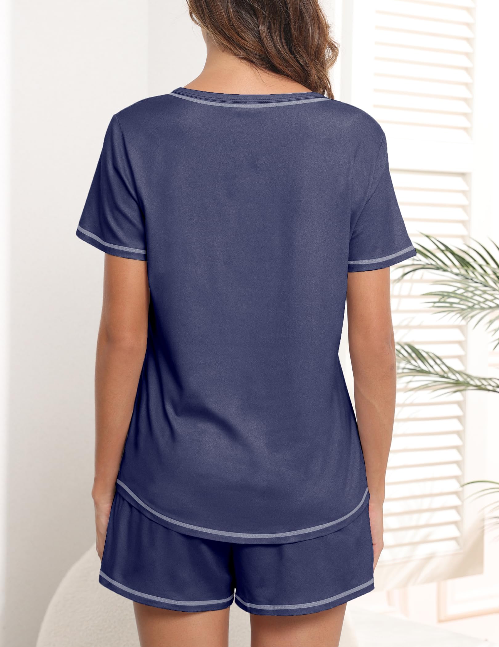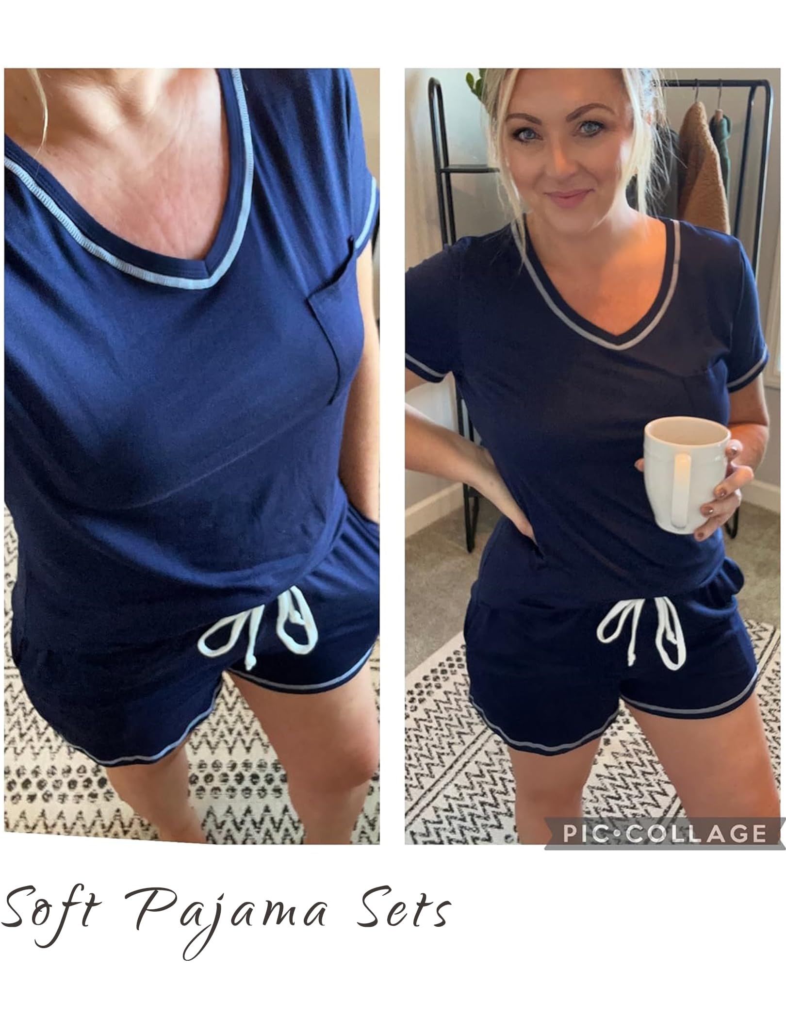 Design: The pajama top features classic chest pocket and V neck, with exquisite hemming workmanship; the pajama shorts features adjustable drawstring and pockets. Loose fit lounge sets, cute and comfy pajamas for women and teens girls