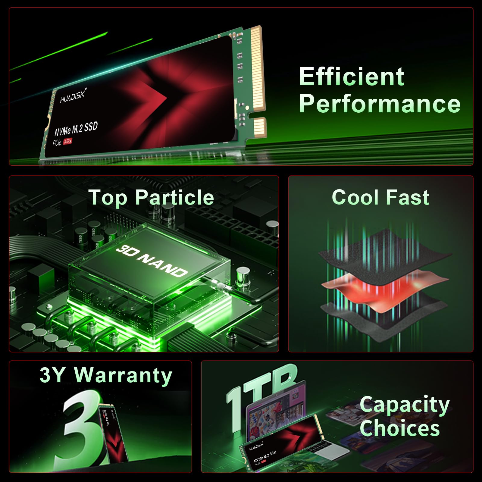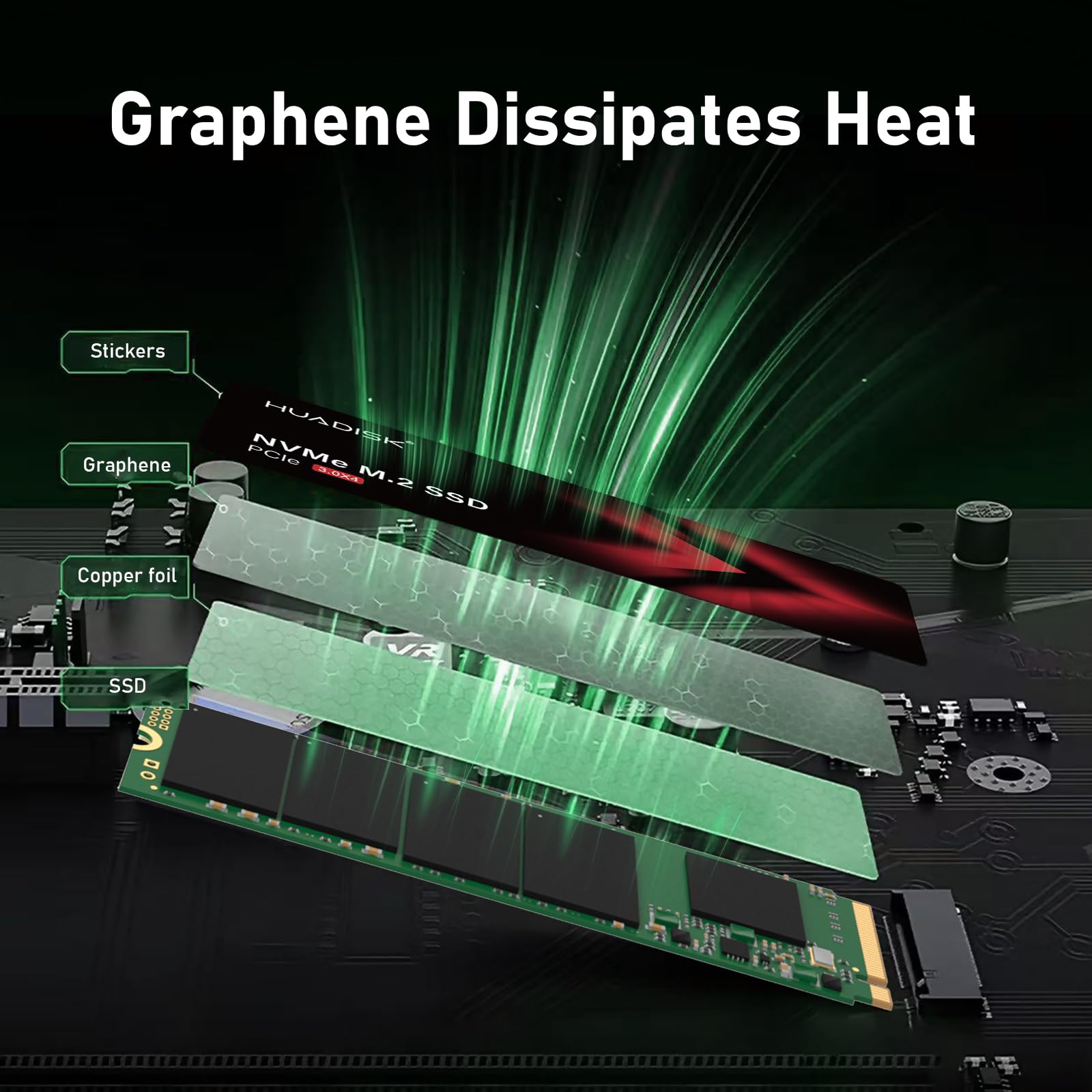 SSD Graphene Cool: Huadisk NVMe SSD M2 has graphene layers for heat dissipation. Graphene, cuts the internal ssd drive temp by up to 10°C (±), avoiding overheating in heavy tasks like transfers, 4K editing, gaming for stable, long-lasting use