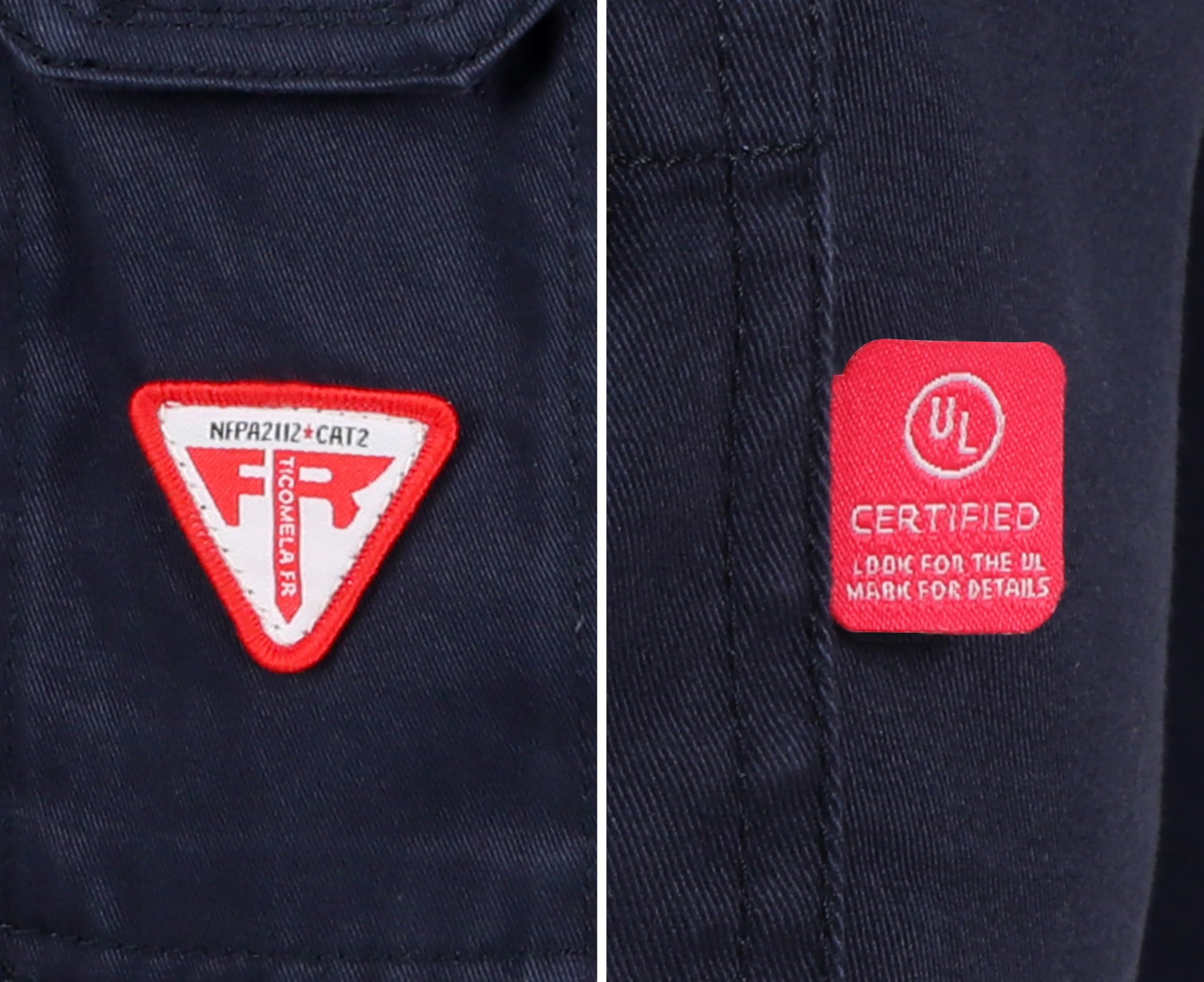 FR MATRIALS:7.5OZ Cotton Twill FR Treated,FR Buttons,FR Sewing Threads!Clear FR Tag on Phone Pocket front.More FR info On Neck Tag About UL Certification.We Attached A Small Sample Inside Package For Cunstomers Simple FR Try