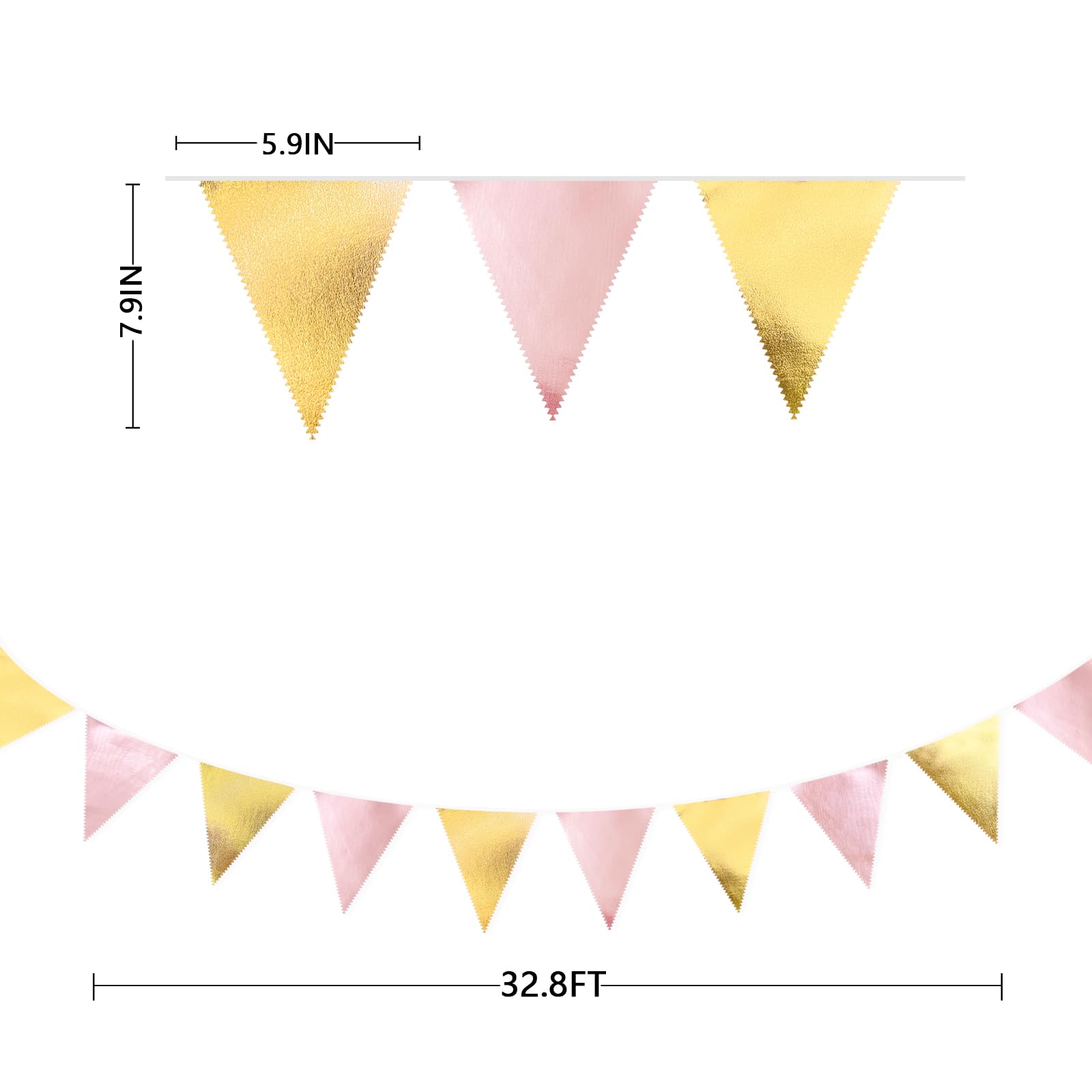 Package Contains - 1 packs of gold and pink party metallic fabric pennant banner, Total 32feet with 36pcs flags.Size of each flag is 7.9 x 5.9 inch.