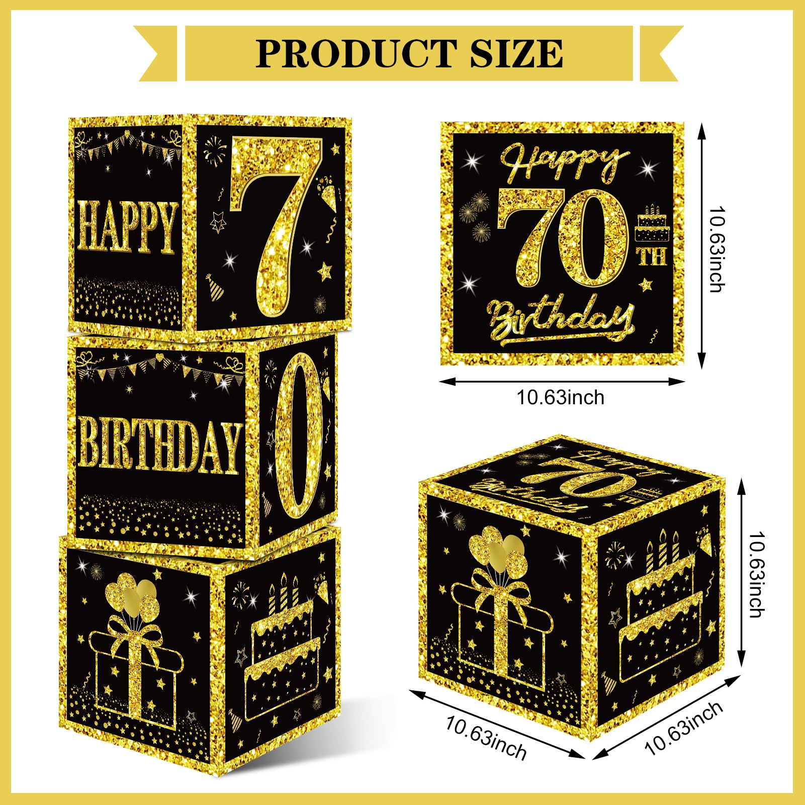 [You Will Receive] -3pcs black gold 70th birthday balloon boxes decorations, the size of each box is 10.62×10.62×10.62inch. This set of great 70th birthday party display decorations. (Note: This set of decorations does not include balloons).