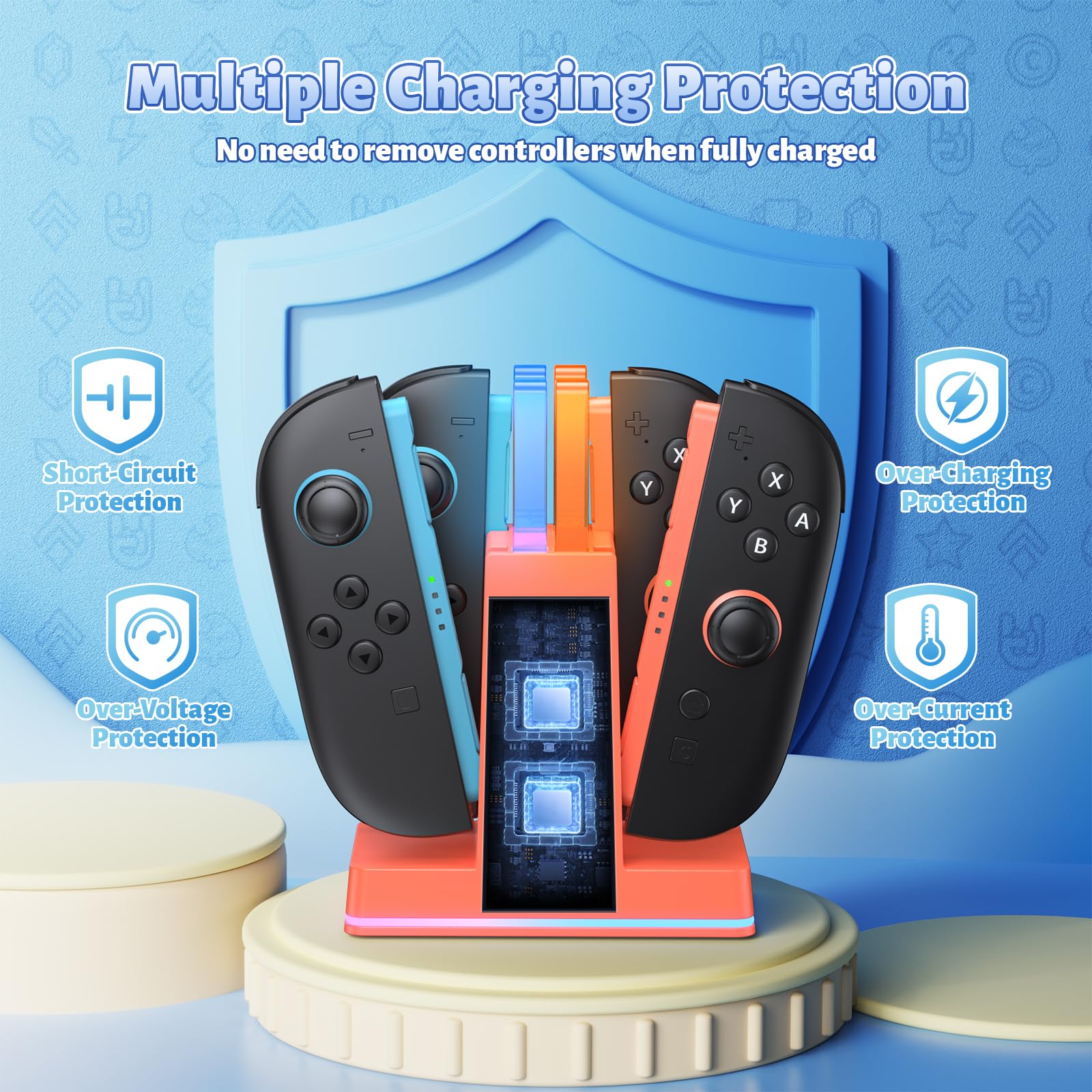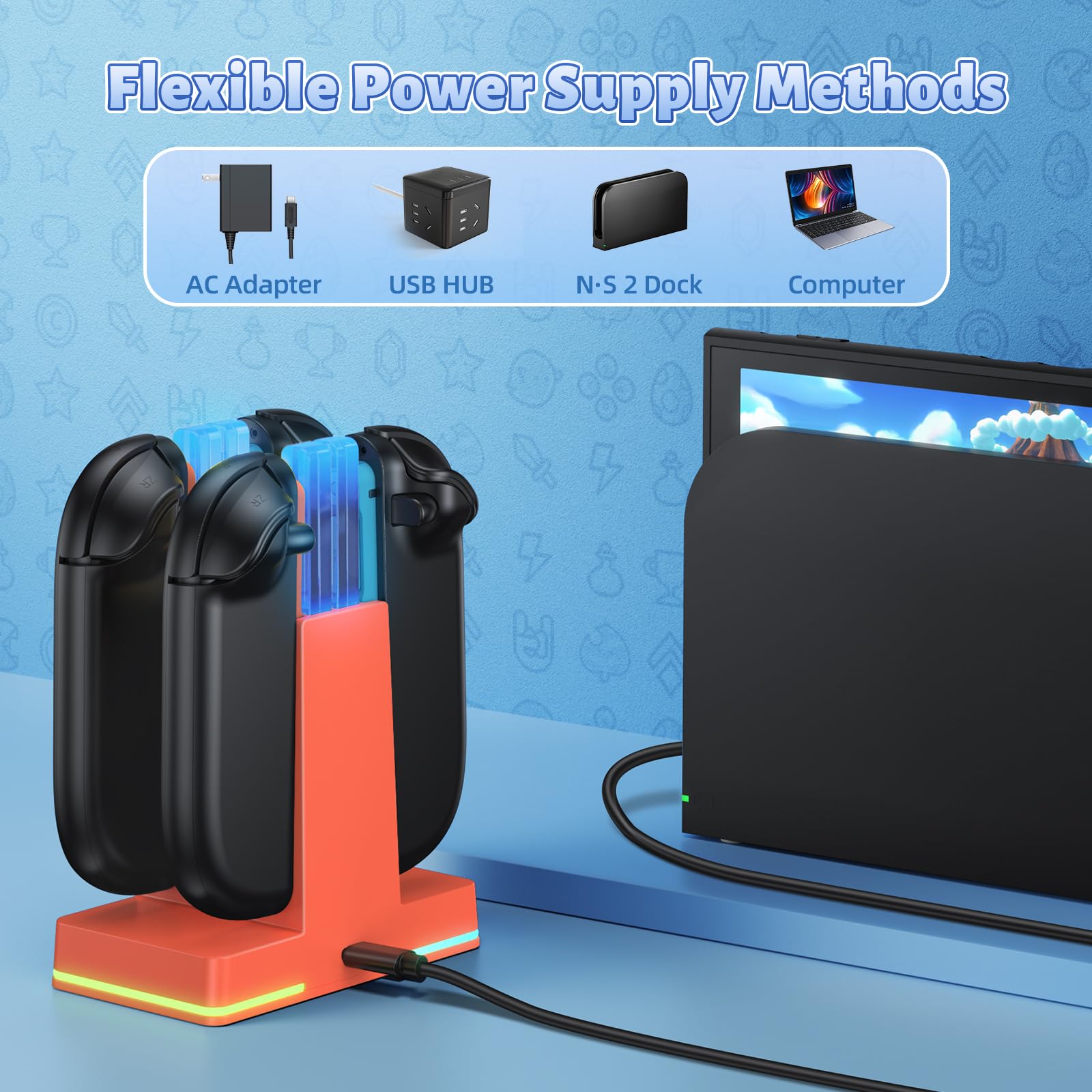 【Advanced Safety & Multi-Power Compatibility】Our charging dock for Switch 2 Joycon equipped with multiple protection features(overcharge/overcurrent/short-circuit/overvoltage protection) , ensuring a safe charging experience. With various power supply options, including AC adapters, the console dock, or your computer—you can conveniently charge for Joy-Cons 2 wherever you play. If you have any questions, please feel free to contact us at any time, we will provide 7*24h friendly service.