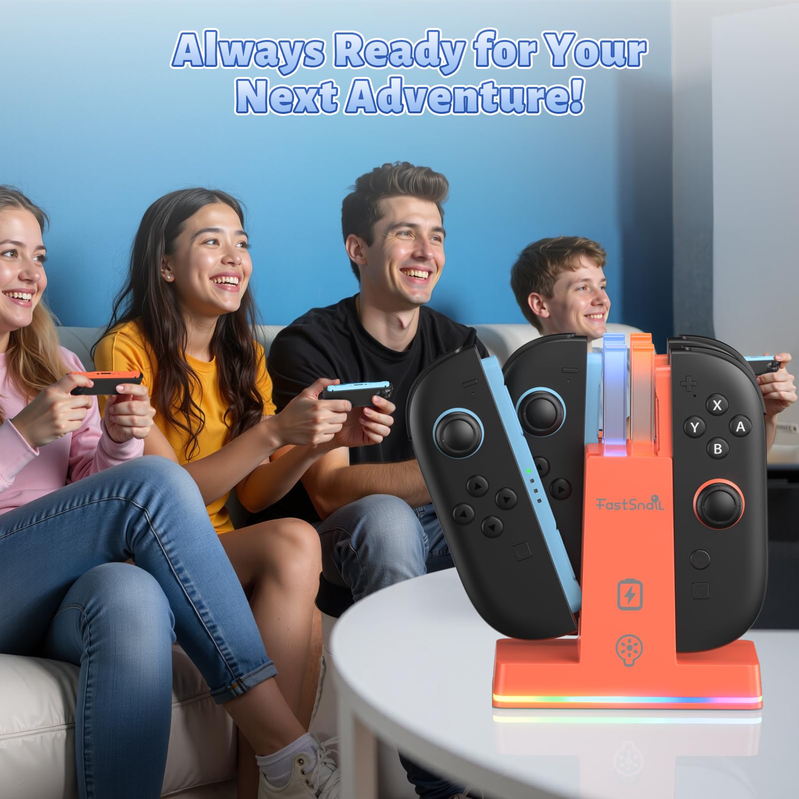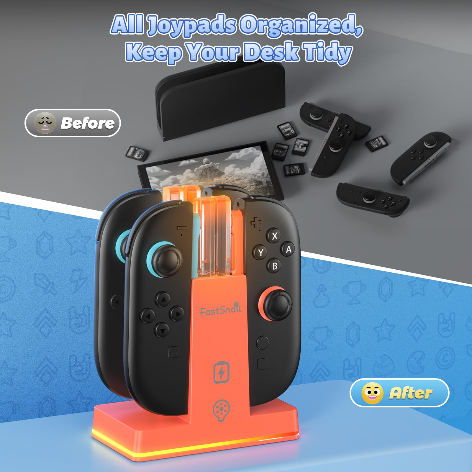 【Simultaneous 4-Joypad Charging & Storage Function】This Switch 2 joycon charging dock can quickly charge up to 4 controllers simultaneously, Plug and play charging, A full charge takes about 2.5-3 hours, ensuring you never run out of battery while playing. Ideal for multiplayer nights or solo gaming marathons. Our joycon charger for nintendo2 also serves as a convenient storage stand, helping to keep your desktop clean and organized.