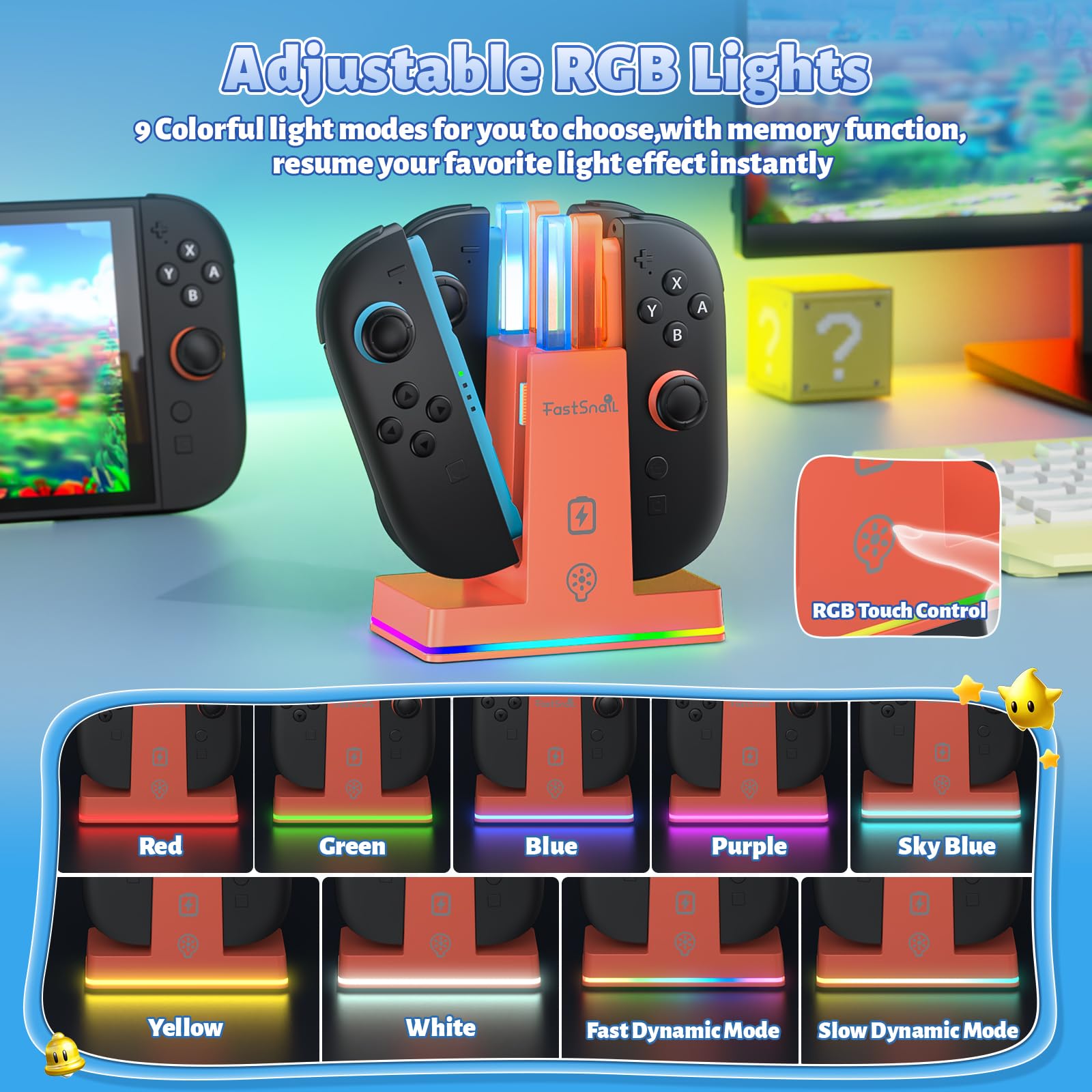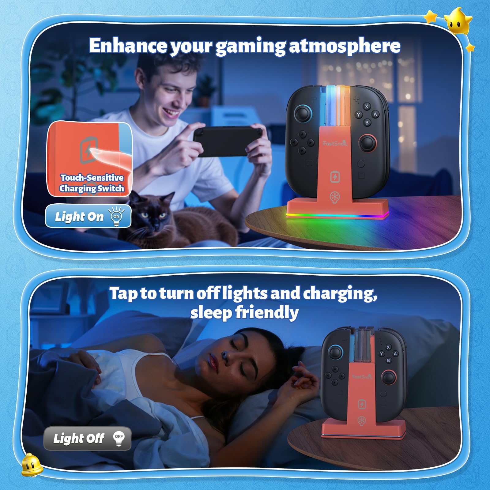 【Customizable RGB Lights with Memory Function】The switch2 joycon charger can enhance your gaming ambiance with 9 vivid lighting modes: 7 static colors + 2 dynamic effects. The switch2 charging stand for Nintendo 2 features a LED button, Touch the button switch light mode, long press 3 seconds to turn off the light. Smart memory function retains your last setting, so lights reactivate automatically when powered on, Can't wait to start the next game adventure.