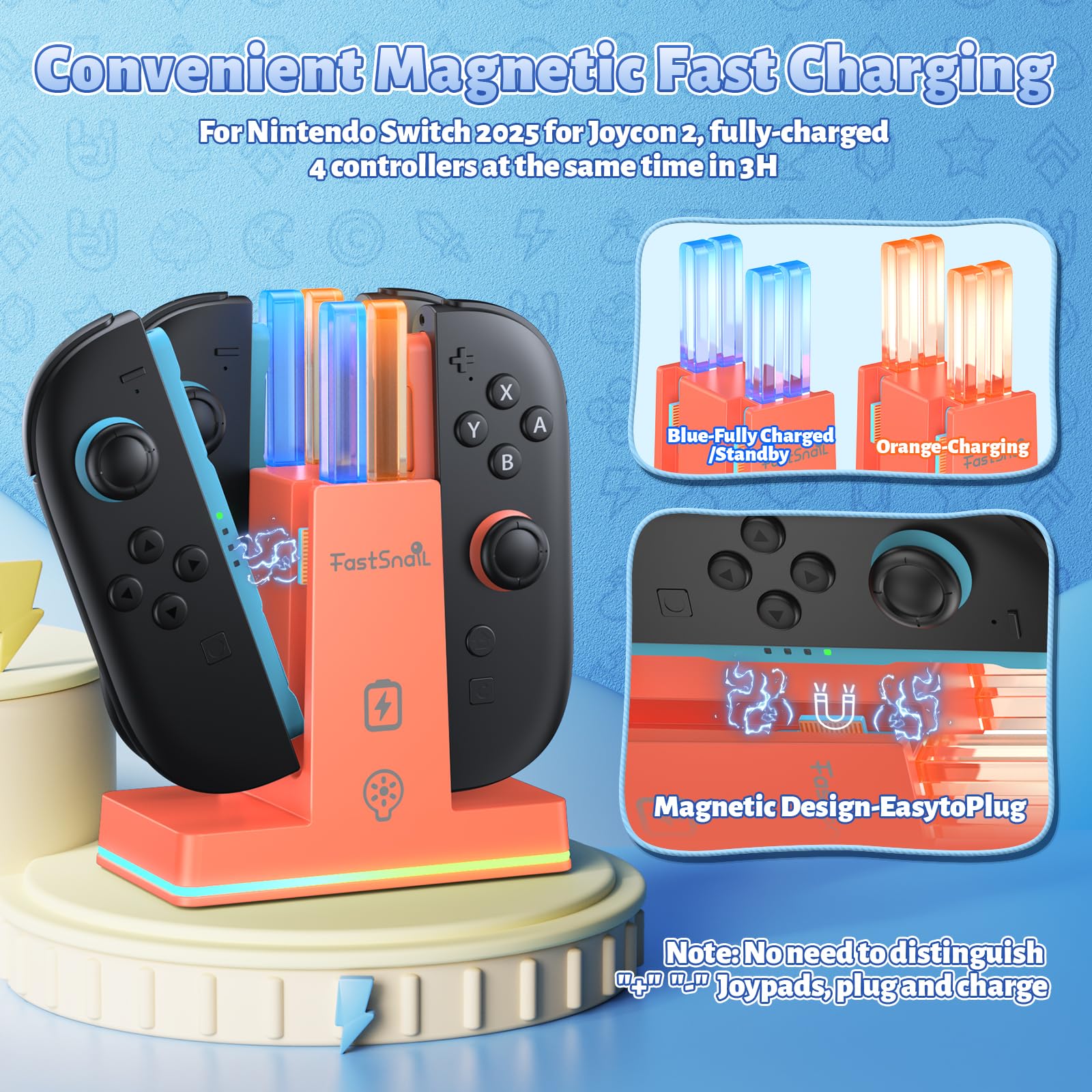 【Magnetic Charging Dock for Switch 2 (2025)】Our Fastsnail switch2 controller charger is designed exclusively for Nintendo Switch 2 Joycon, the switch2 joycon charger dock features magnetic alignment for effortless charging—no need to distinguish +/- joypads. Securely holds for Switch 2 Joycons in place while preventing damage from repeated plugging. Perfect for quick swaps during intense gaming sessions (Switch 2 Console and Joypads are not included).