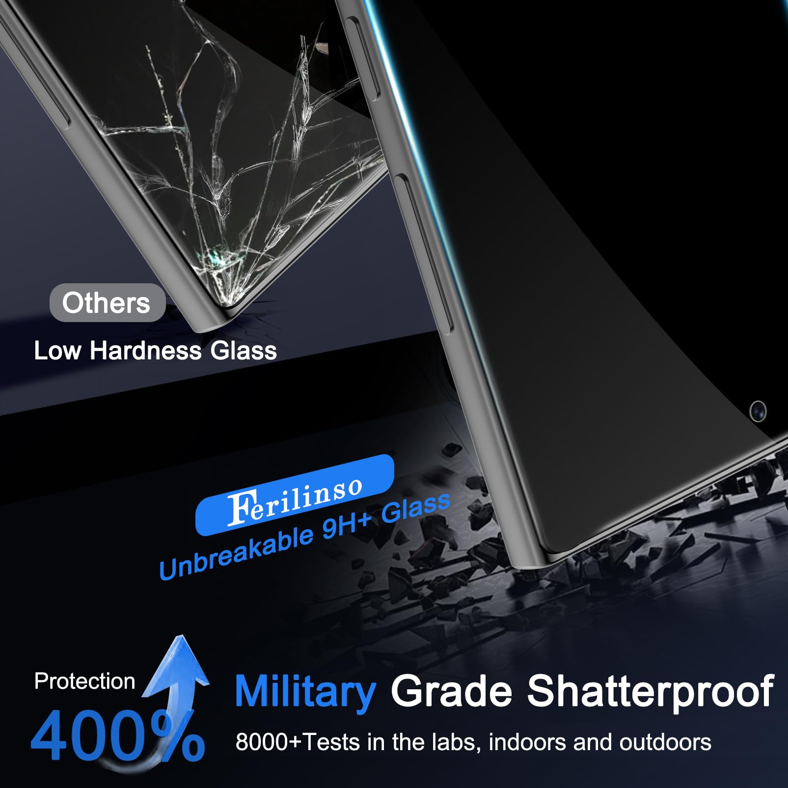 Unbreakable 9H+ Privacy Glass, 2nd Screen of your : Unmatched shatterproofness and durability, it's designed specifically for the Samsung Galaxy S25 Ultra screen. 9H+ Tempered Glass material is the core, which is widely used in aerospace and military for its ①Shatterproof ②Scratch & Wear Resistant ③Durability is 8-10 times superior to others. Thus, 9H+ Glass creates a 2nd tough screen for your Samsung Galaxy S25 Ultra.