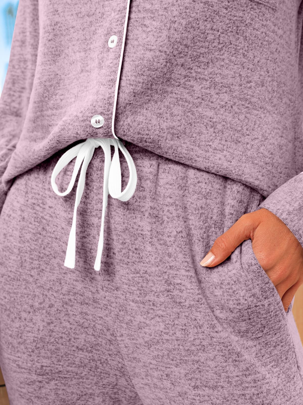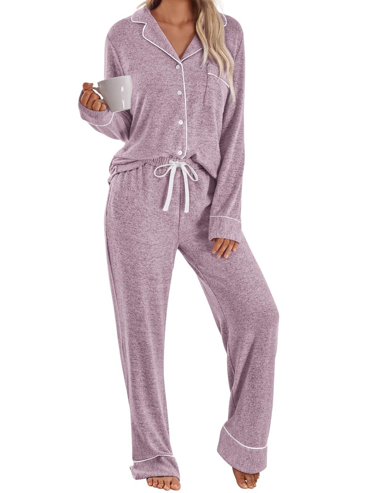 Fashion Design: Womens casual long sleeve v neck button down pajamas sets, pants with drawstring elastic design