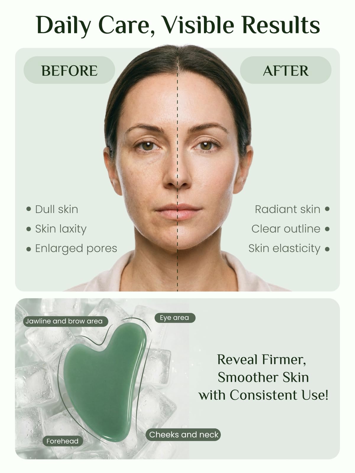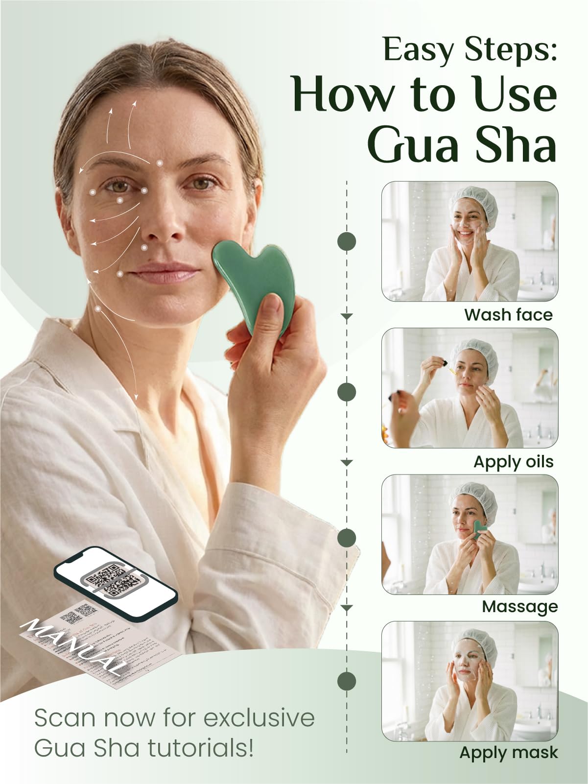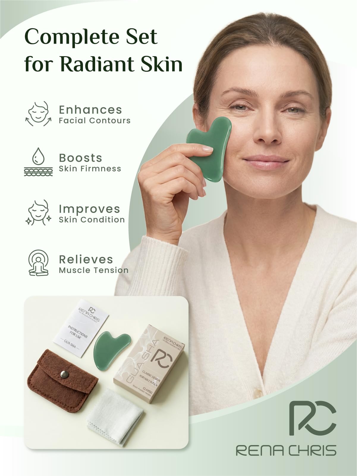 BENEFITS OF GUA SHA: Inspired by traditional beauty rituals, this facial tool helps awaken your complexion and visibly reduce morning puffiness. Regular use assists in sculpting the jawline, smoothing the skin's appearance, and relaxing tired facial muscles