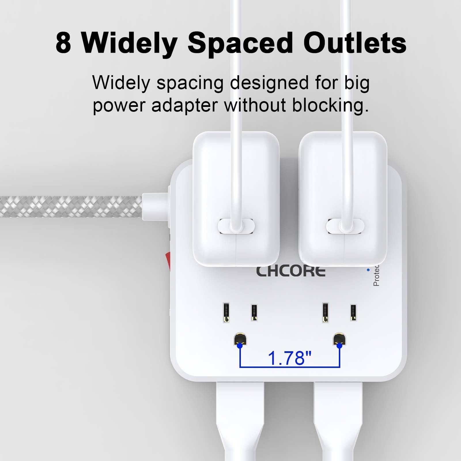 【12 IN 1 Surge Protector Power Strip】- The 3-side design surge protector power strip with 8AC widely outlets and 4 USB charging ports(2 USB C Ports), 10 Feet extension cord(1250W/10A), can power up to 12 devices simultaneously. Wide range voltage design, can be used on 100v to 240v circuit. The compact design saves more space, suitable for the home, office, and college dorm room essentials.