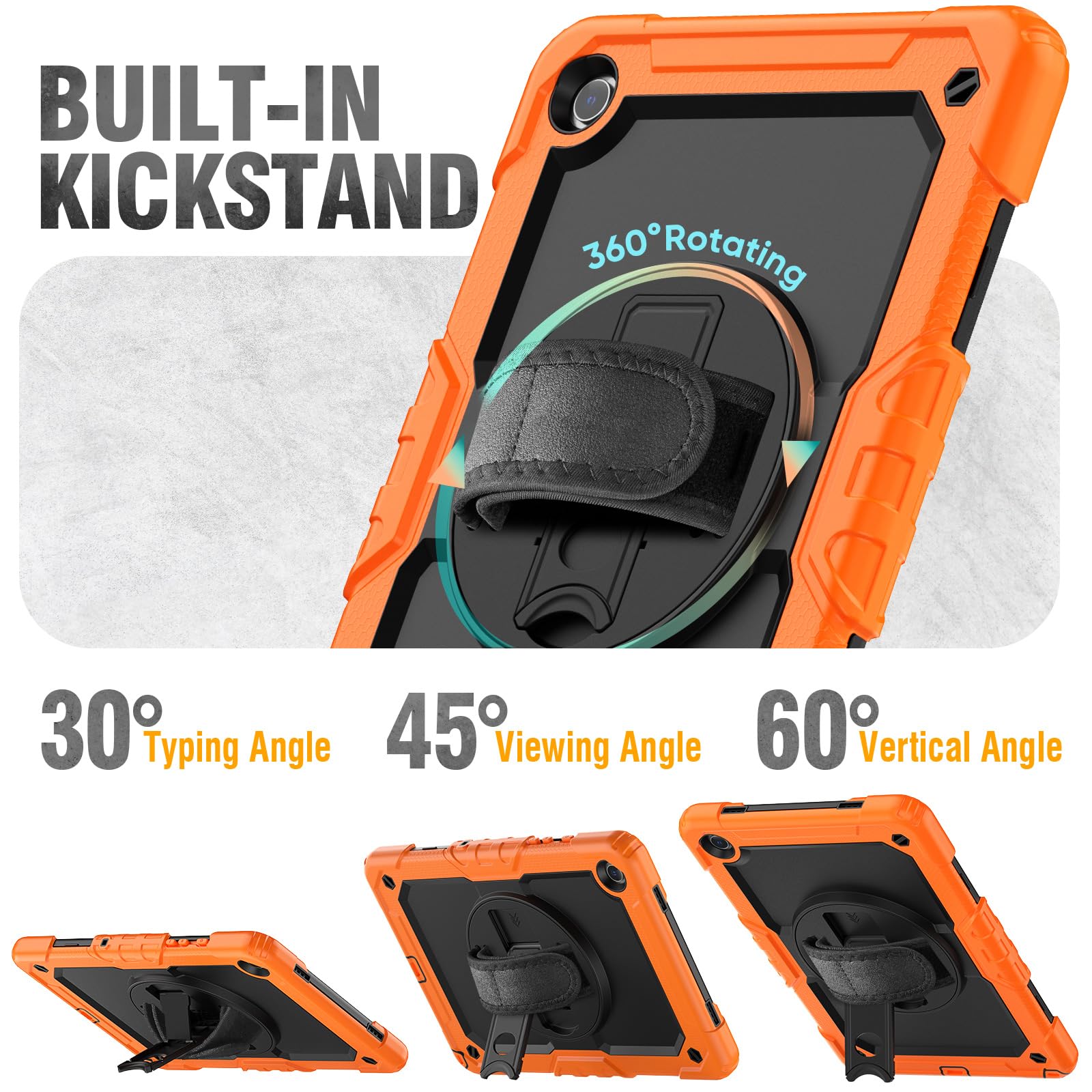 360 Rotating Hand Strap & Stand : With adjustable swivel hand strap and stand, you can hold the tab A8 10.5 inch tablet by one hand and find the most comfortable viewing angle you need. The built-in stand provides a stable supports, with viewing/drawing/typing angles you need, and it can be folded up when not in use.