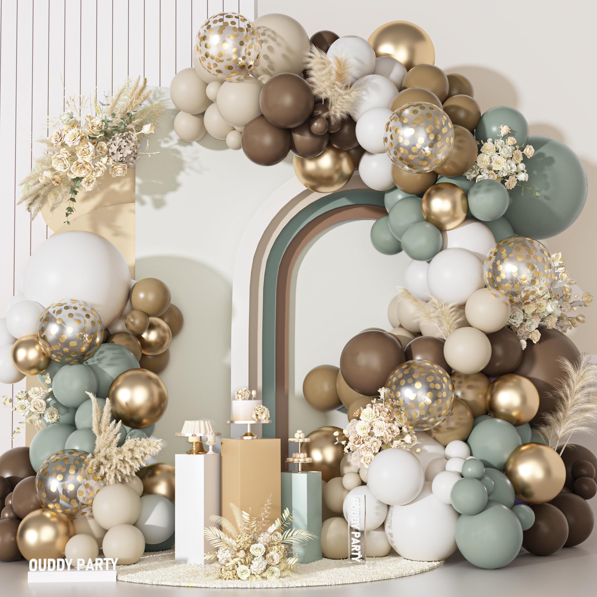 Dusty Green Nude Balloon Arch Kit: Includes 3pcs 18in balloons(dusty green/brown/white), 18pcs 12in latex/confetti balloons(dusty green/brown/white), 83pcs 10/5in balloons(nude/dusty green/brown/sand white/white/champagne gold), 5pcs balloon tools