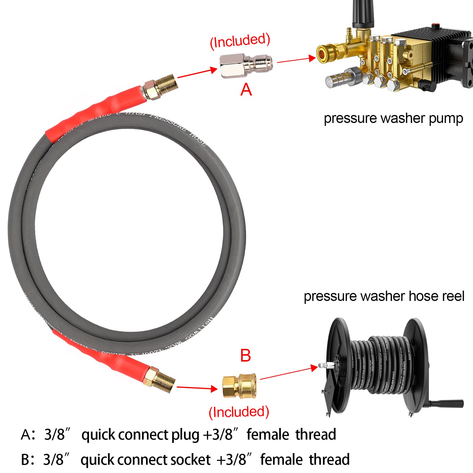 ✅【Quick Connect 】- Pressure washer hose has quick connectors on both ends to save your time. 3/8” quick connect plug and 3/8” quick disconnect fit most pressure washer and pressure washer hose reel. The quick coupler can also be removed, leaving the threaded end for the hose reel.