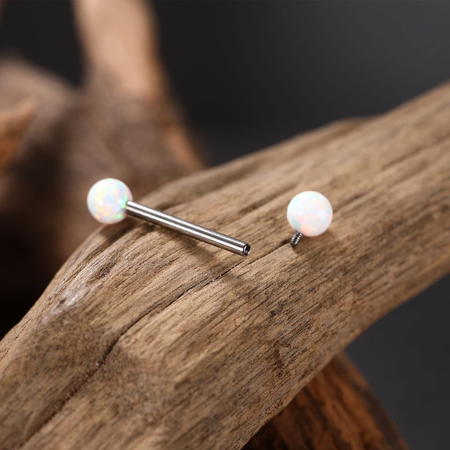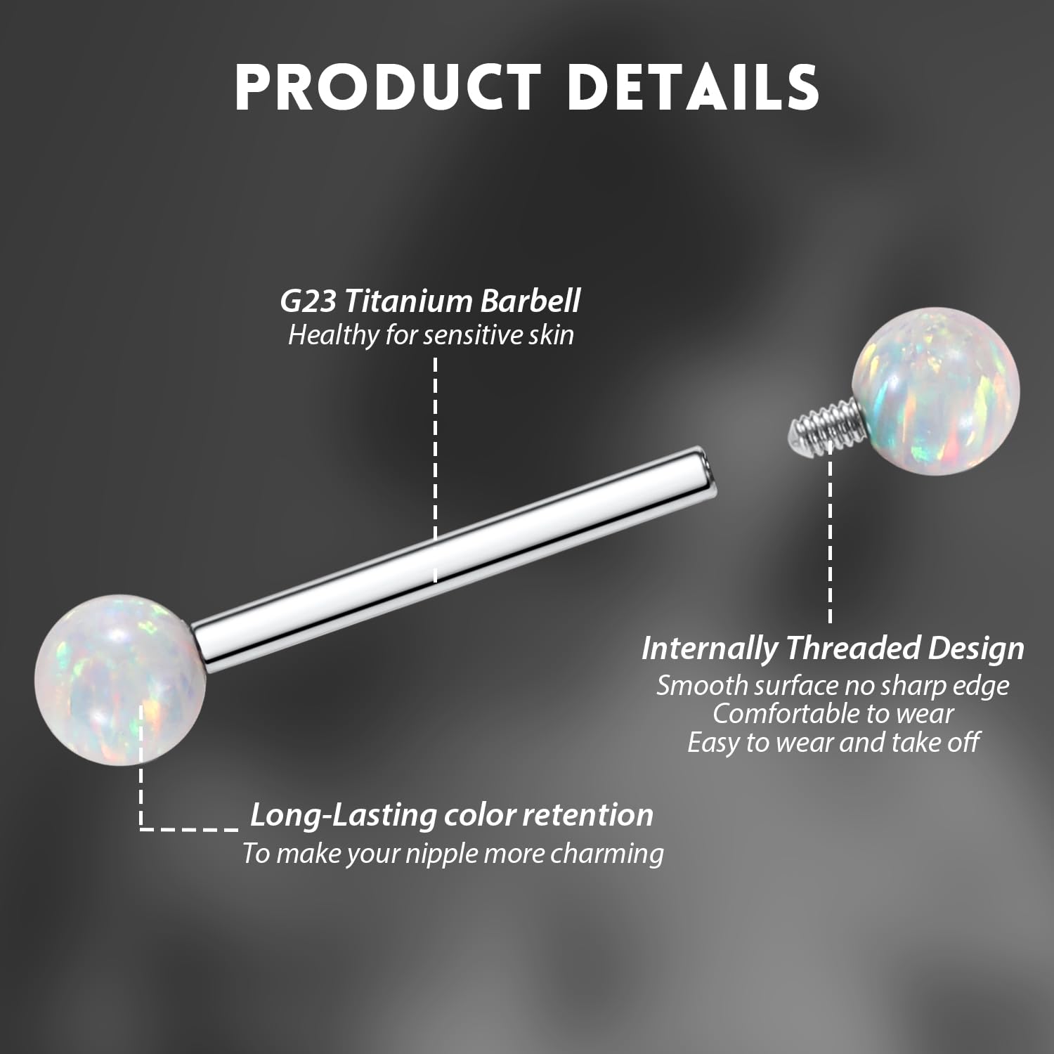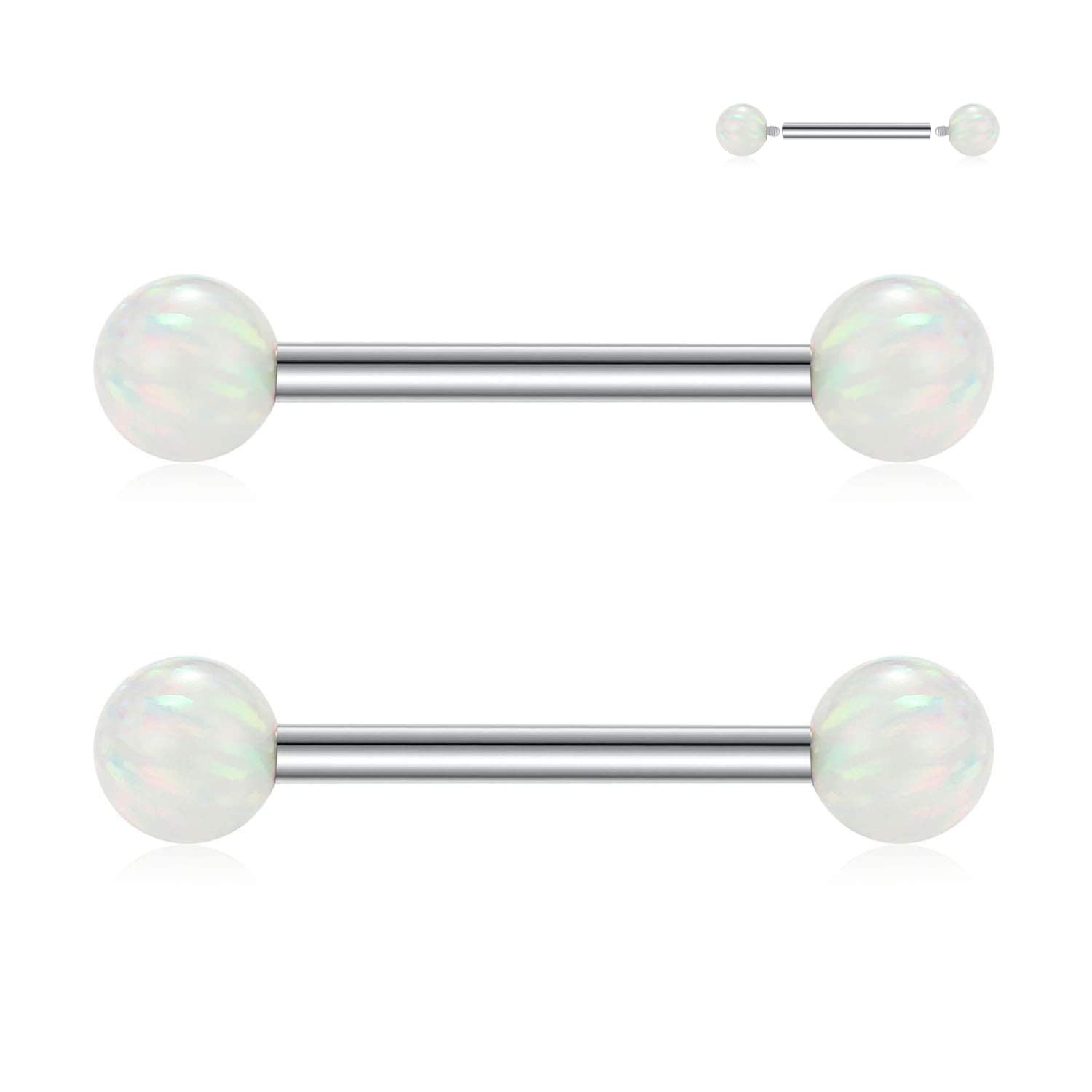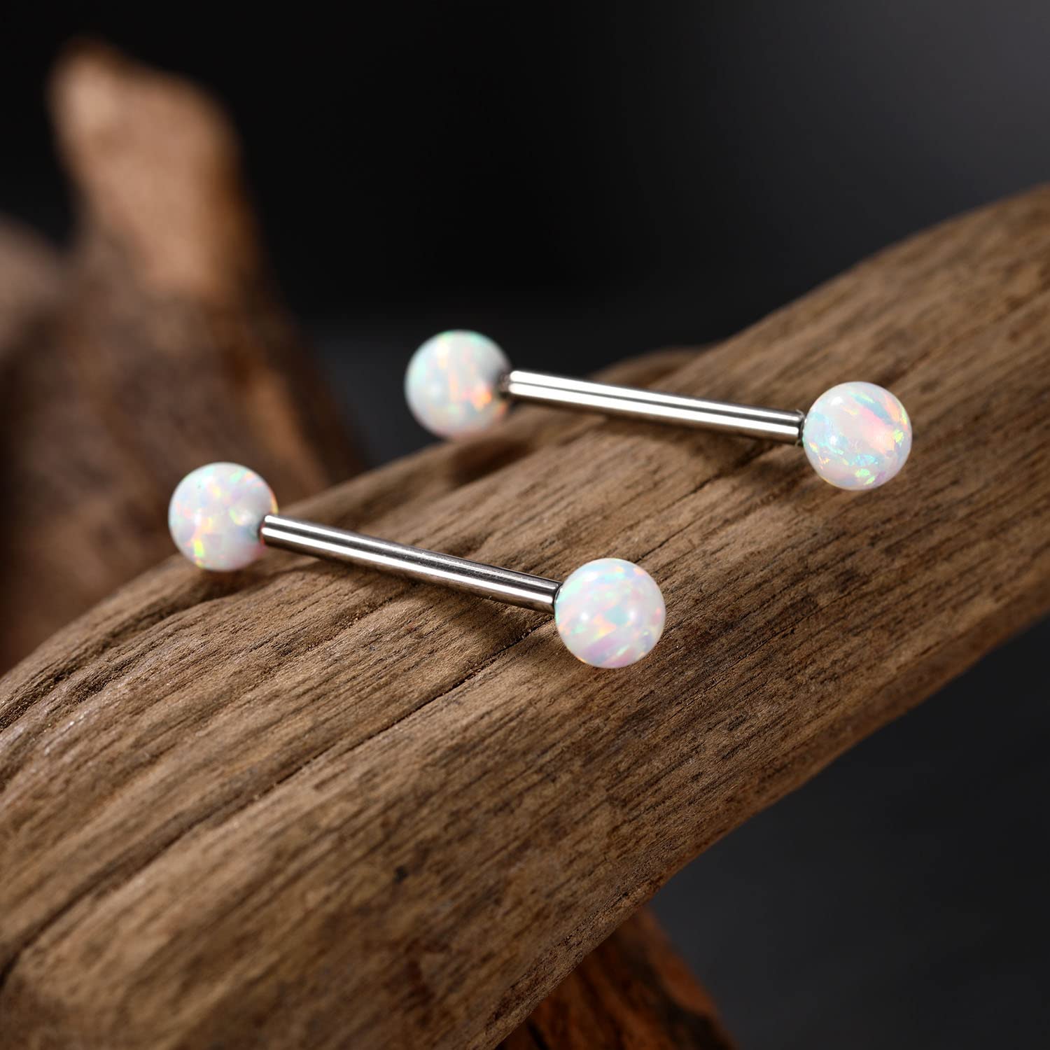 Gauge: 14 G (1.6 mm); Nipple Barbell Length: 18 mm; Opal Color: White; Opal Size: 5 mm