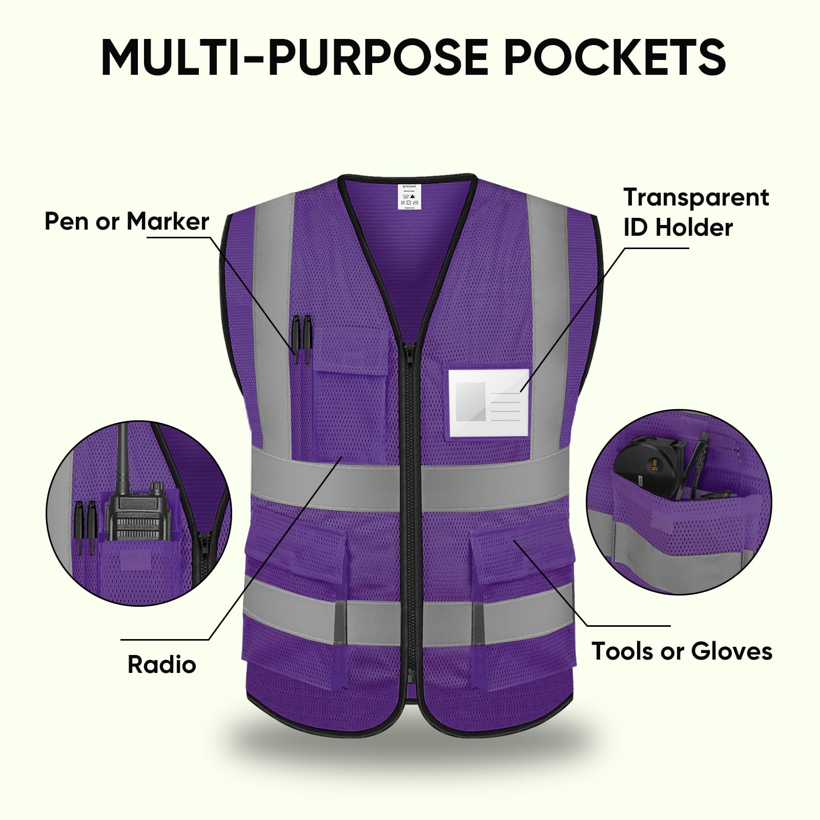 [MULTI-PURPOSE POCKETS] This high visibility vest has functional pockets built-in including a Transparent ID pocket, pen holder, radio pocket, and the 2 large pockets that can hold your tools and gloves.
