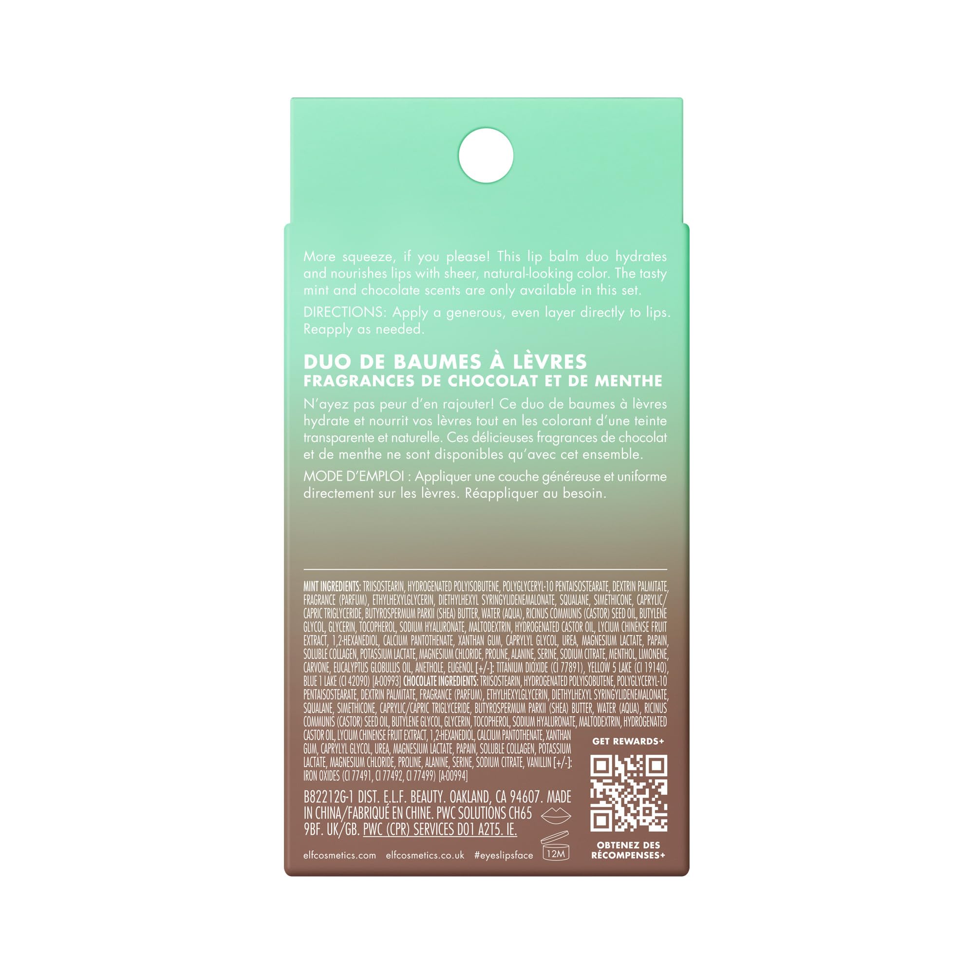 The juiciest e.l.f.ing duo for hydrated lips and a sheer kiss of natural-looking color. This lip set features a pair of our fan-fave Squeeze Me Lip Balms in 2 new, exclusive scents and shades that YOU picked—Mint and Chocolate! These pocket-sized, lightweight lip balms are perfect for on the go. What it is: A lip set featuring moisturizing Squeeze Me Lip Balm in 2 exclusive new shades for nourished lips with a super sheer kiss of natural-looking color. Why you’ll love it: Set of 2 Squeeze Me Lip Balms in new and exclusive scents and shades that YOU picked —Mint and Chocolate Lightweight, hydrating formula Super sheer kiss of natural-looking color Squeeze tube with slanted tip applicator for easy application on the go Boosted with nourishing ingredients Ingredients may change or vary from time to time. Please refer to the packaging of the product received for the list of ingredients in your particular product. All e.l.f. products are proud to be 100% vegan, cruelty-free, and Leaping Bunny Certified. Because kindness is chic.