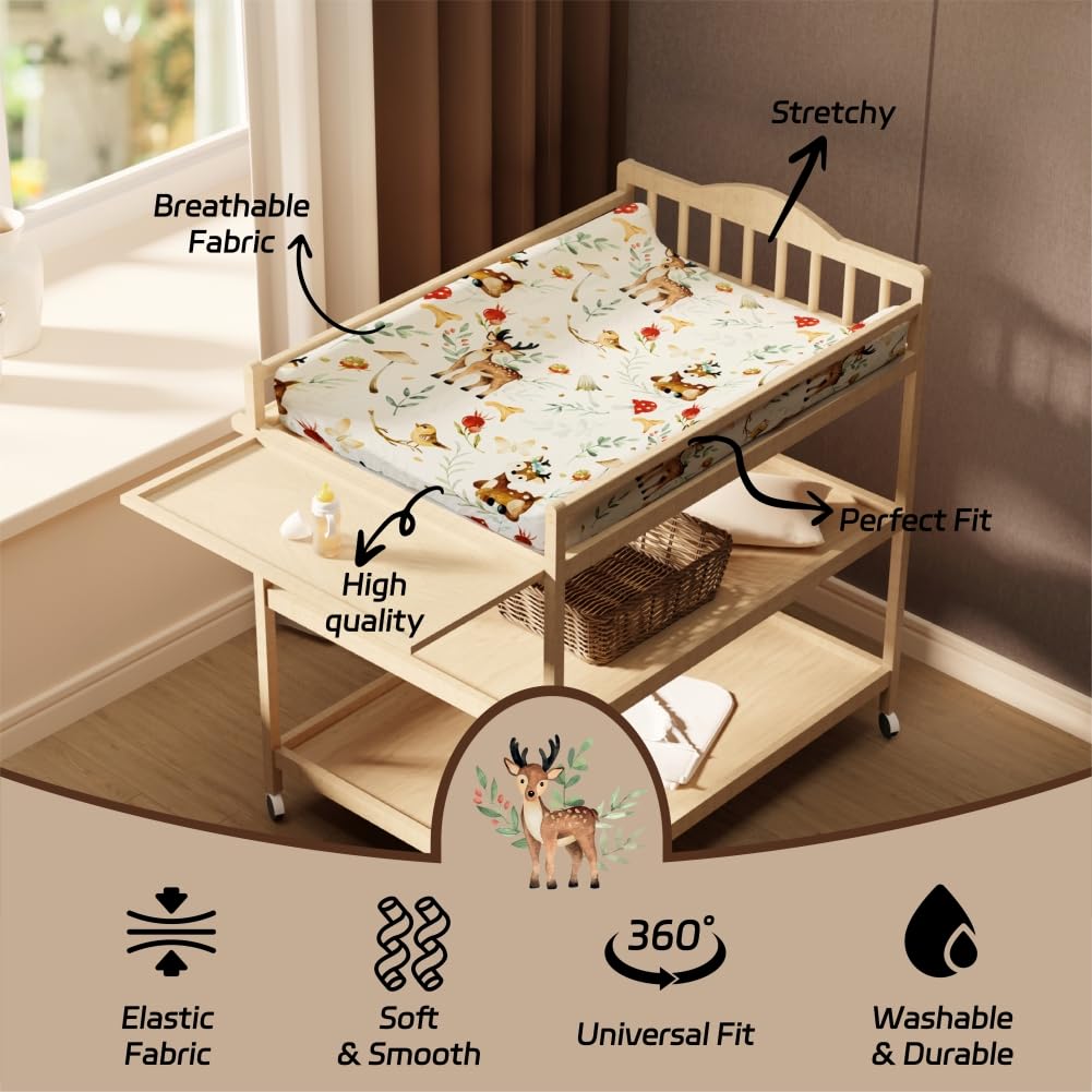 WOODLAND DESIGN: The fitted sheets and easy to use, especial and beautiful design adds a cozy and comfortable look for little baby’s room. And other woodland nursery bedding accessories: crib sheets, portable crib sheets and changing pad covers