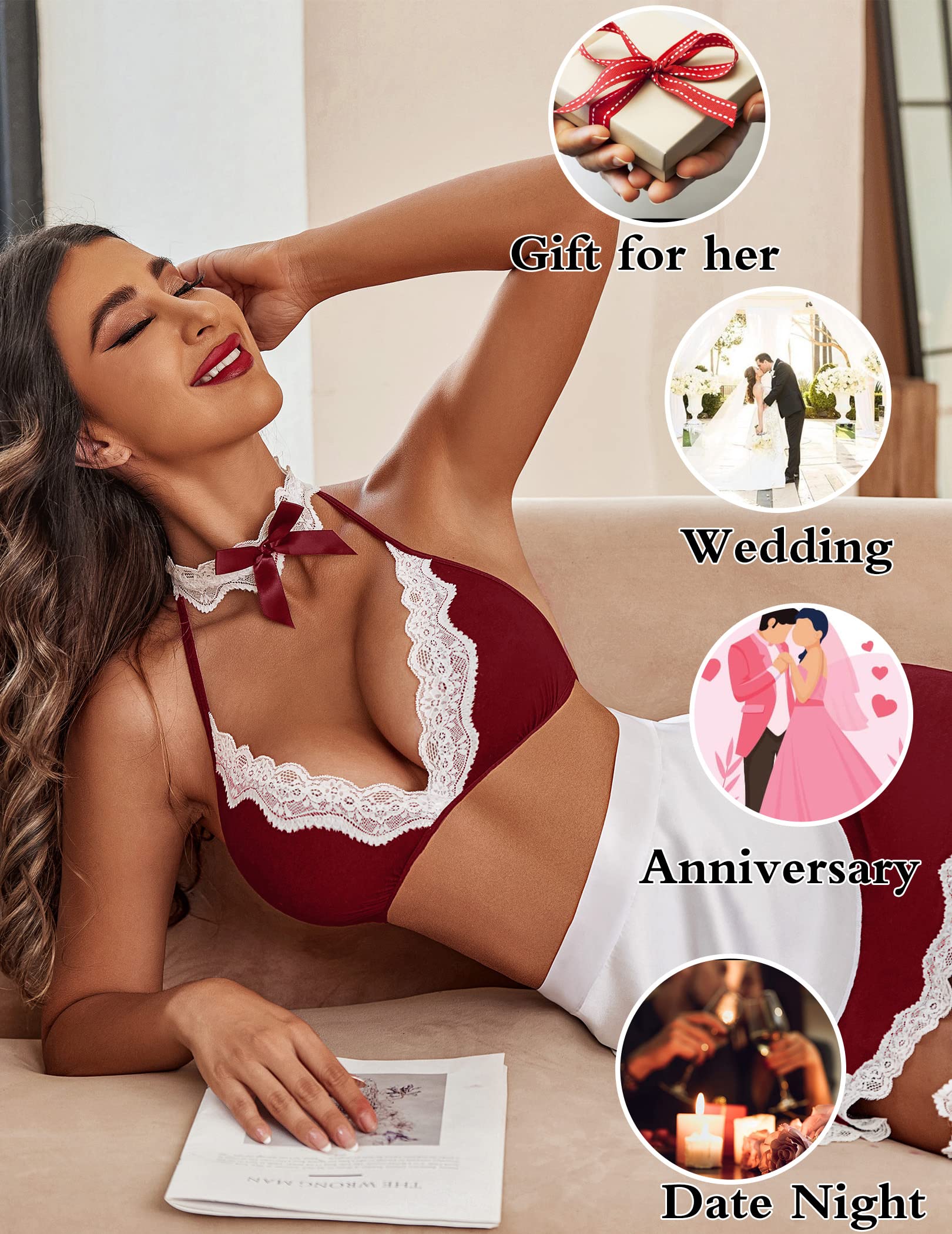 👩❤️👨Maid lingerie for women features with a white headband.A removable choker.Deep v neck self tie bra with white lace trim.A high waist mini skirt with white lace trim at the bottom,matching with G-string panty and apron. It makes your so lovely and charming in front of your lover.