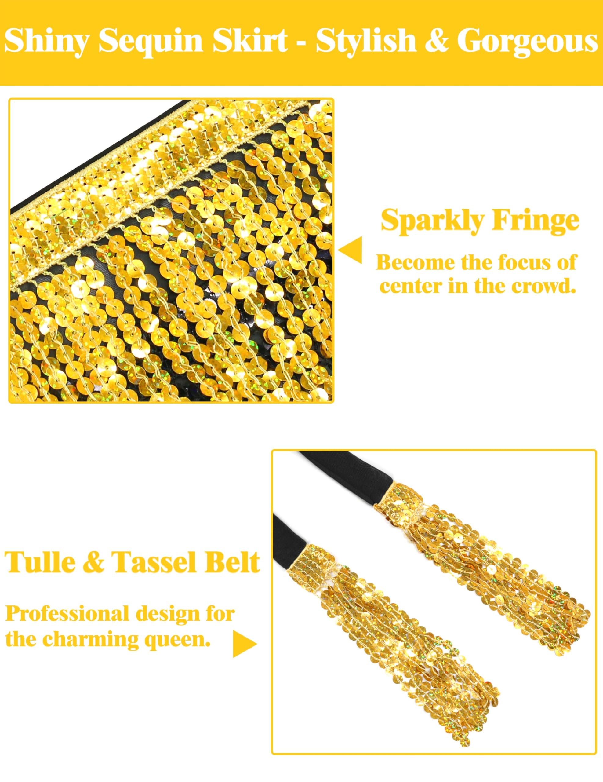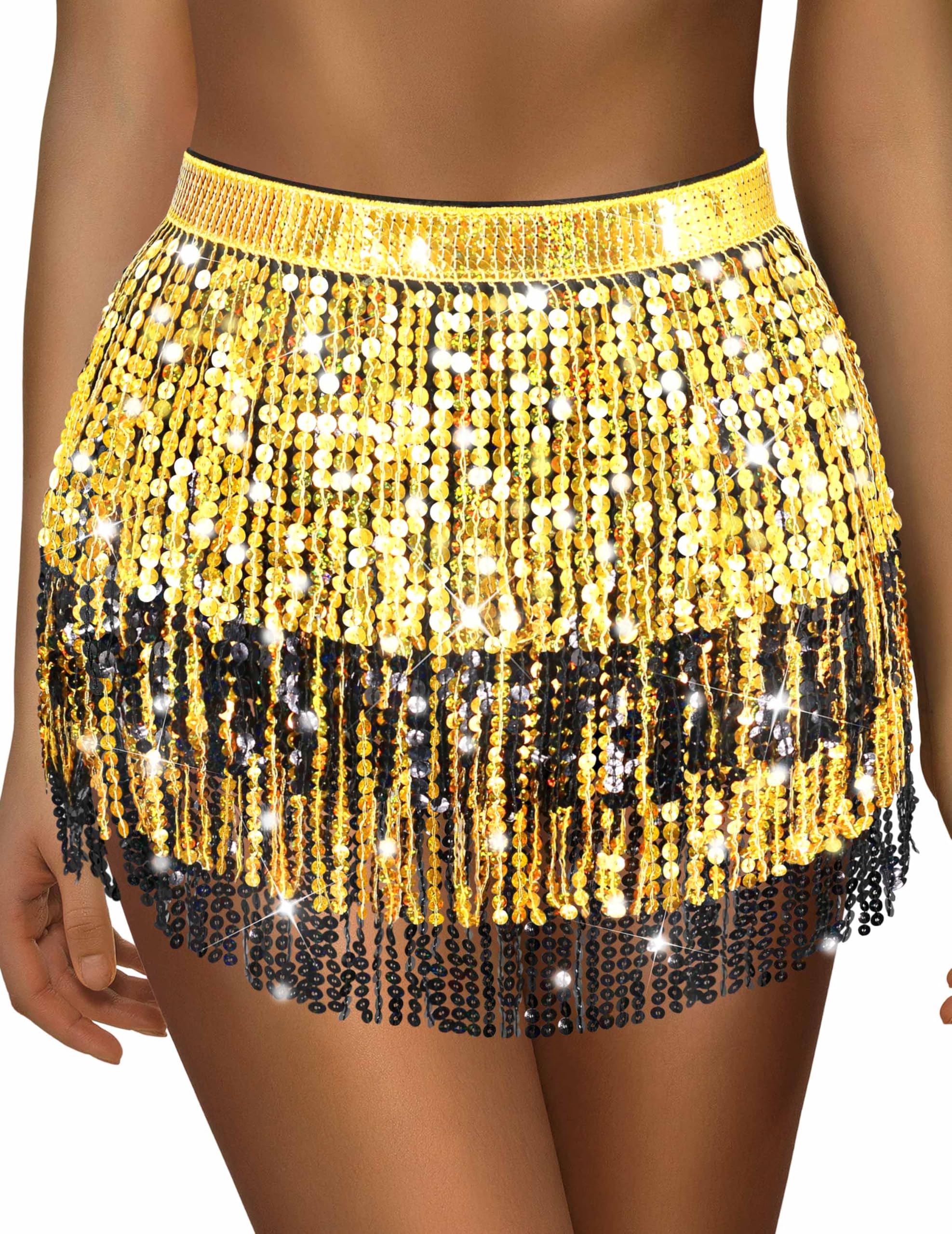 GORGEOUS SEQUINED FRINGE: The belly dance skirt with four-layered sequins and fringes is shinier and more gorgeous, which makes you more acctractive. What's more, the tinsel skirt perfectly fits your curves and showcases your most glamorous side. When you wear this sparkle skirt, people will pay more attention to you and you will be the focus in the crowd.
