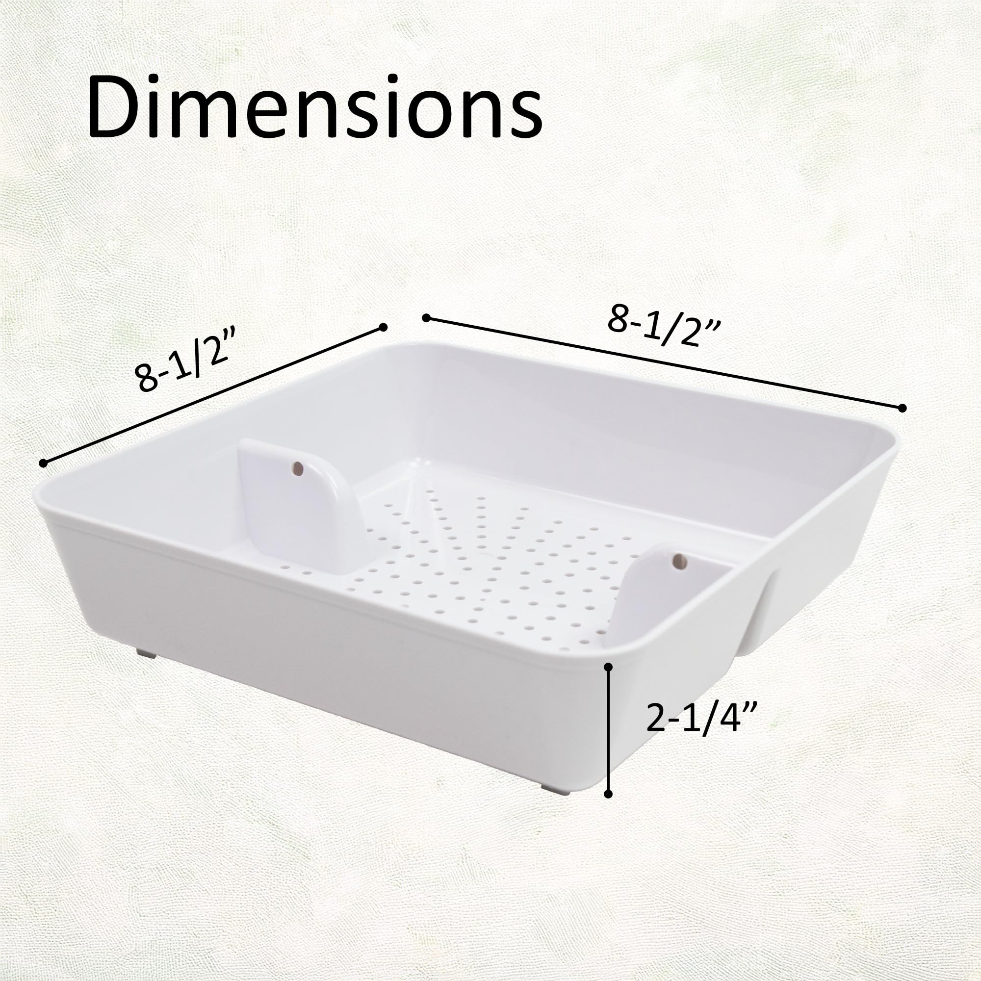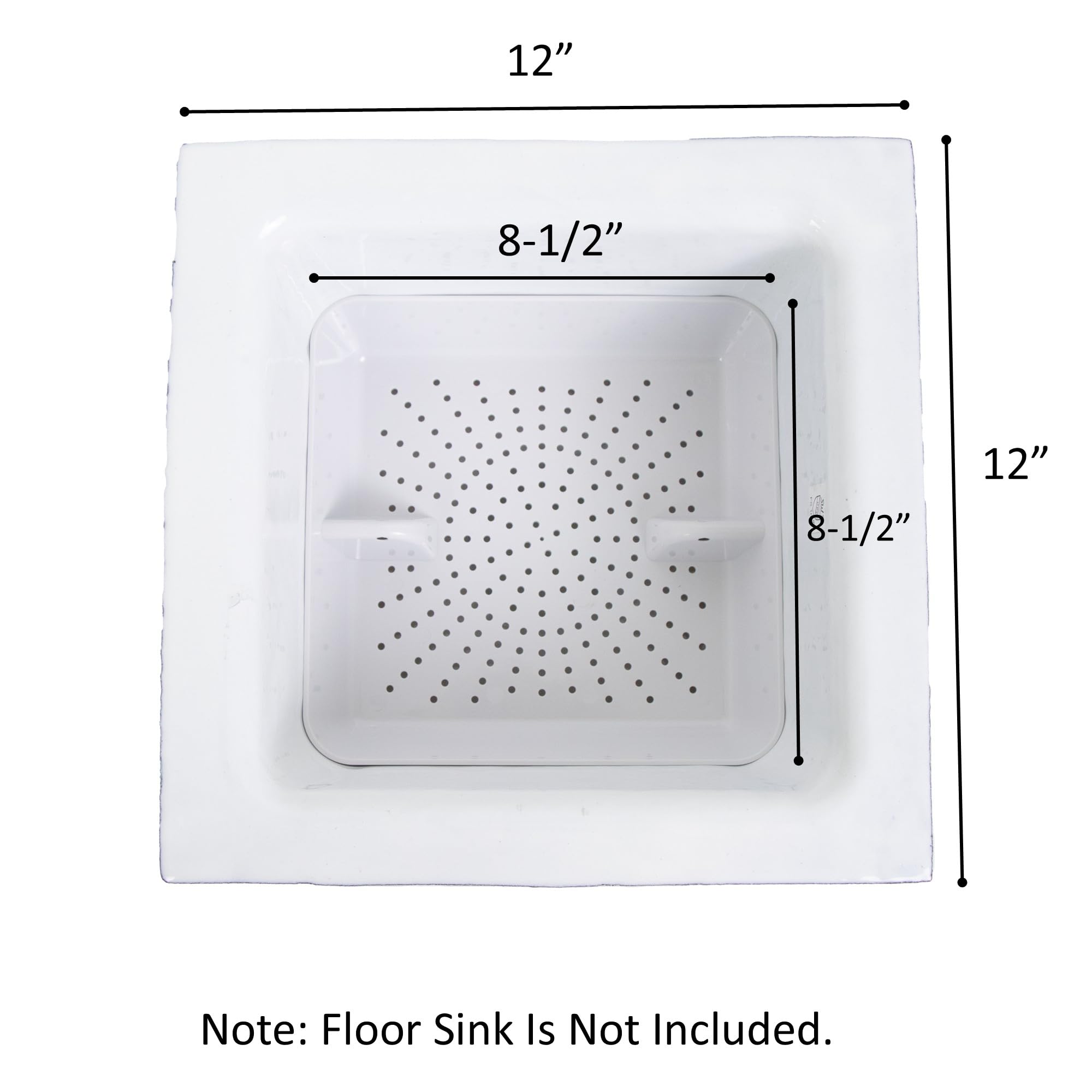 "Easily Removable - Simple drop-in design, fits perfectly. Notches on the side of the strainer make the device easily removable. Fit to 12” x 12” floor sink. Overall Dimensions: 8-½” W x 8-½” L x 2-¼” H."