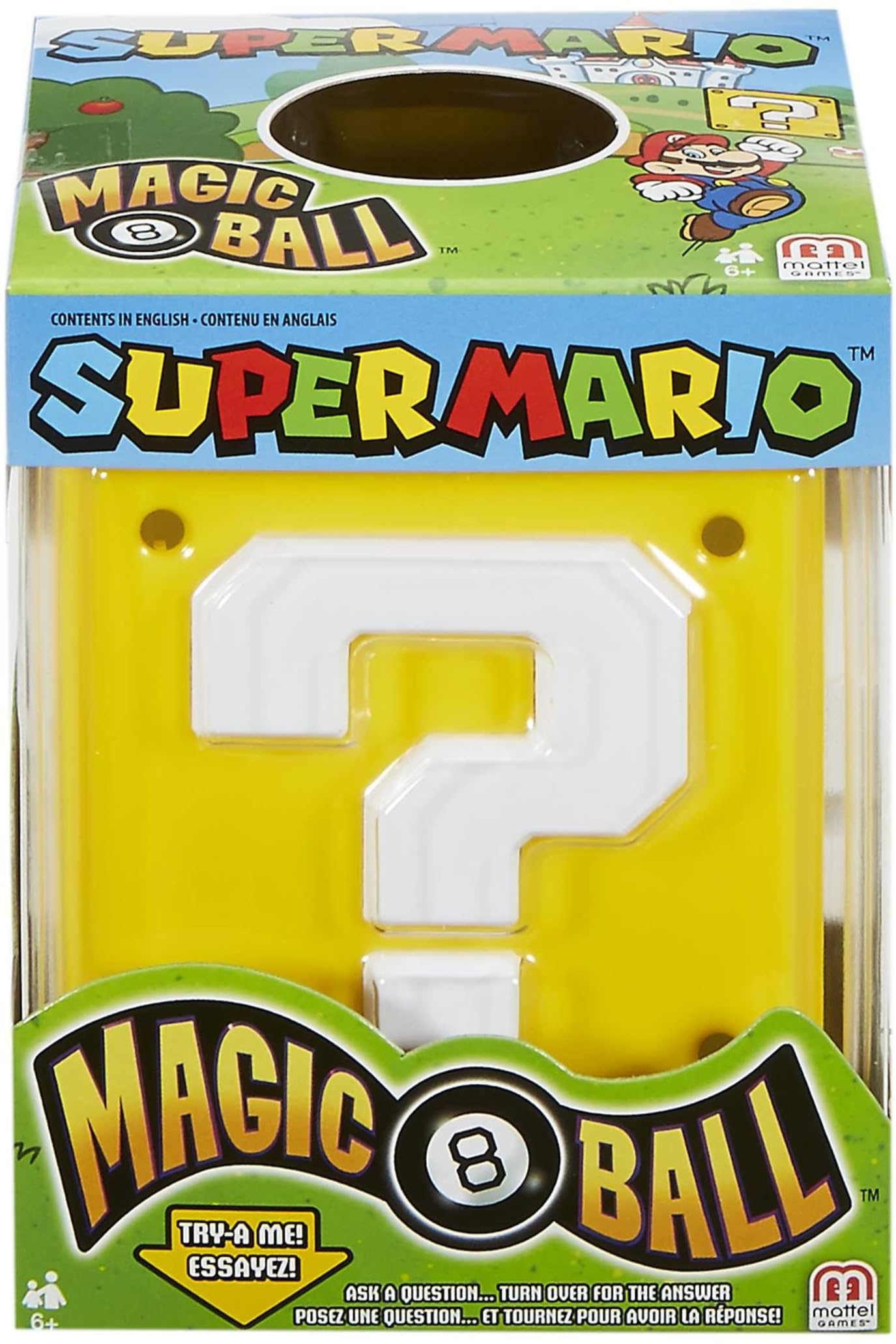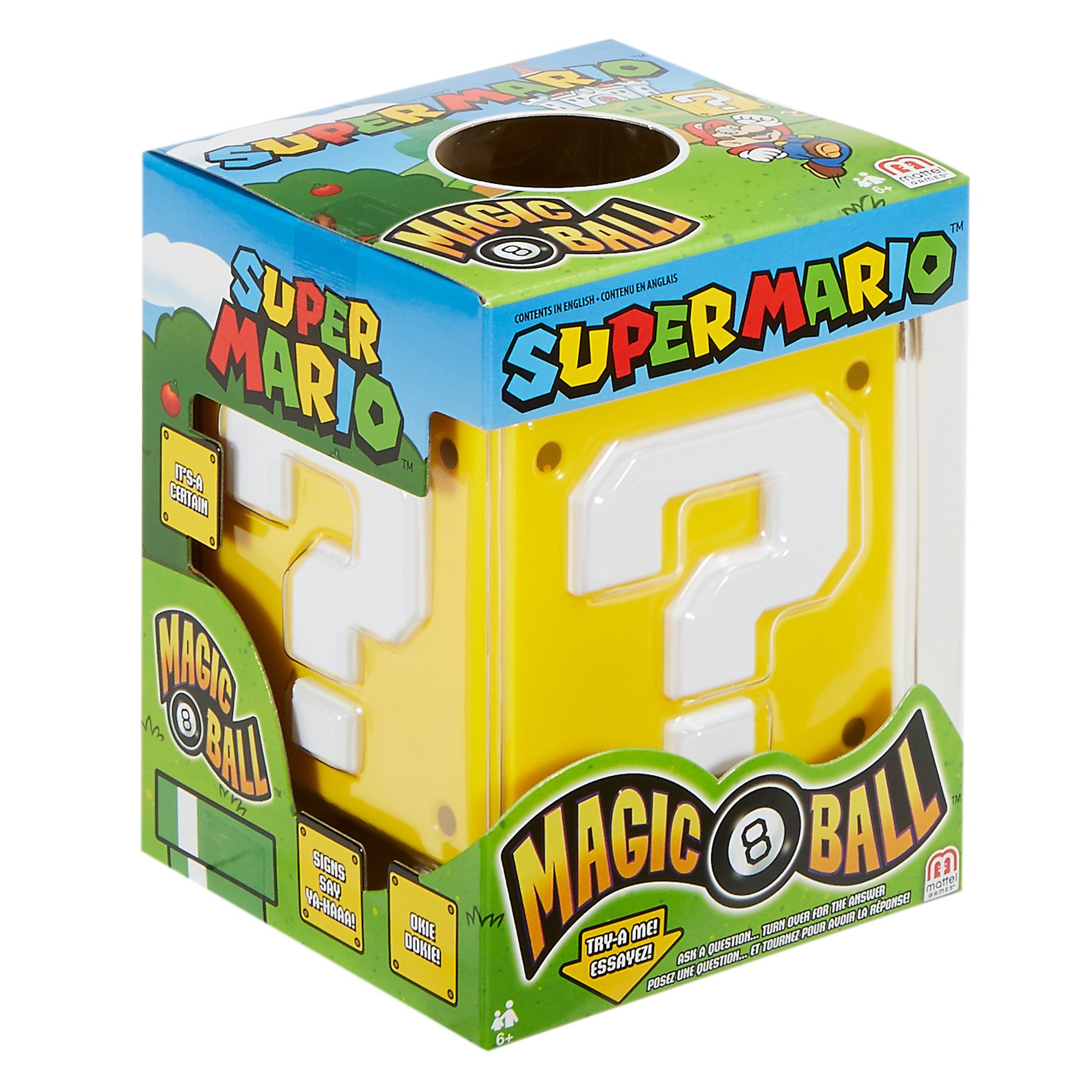 The Super Mario Magic 8 Ball has the answers to your most pressing questions! Now with Super Mario‐themed answers, this novelty toy offers fortune‐telling fun and intrigue for everyone. And this Magic 8 Ball is actually a cube! Start by asking the ball any "yes" or "no" question, then turn it over to watch your answer appear the window. Answers will appear, like "No way, amateur!" and "Wowzer—outlook good." Let Super Mario wisdom guide you into the future—Wa‐hoo!! Designed with the infamous Super Mario question block, it's a must have for kids and lifelong Nintendo fans. Makes a great gift for collectors! Colors and decorations may vary.