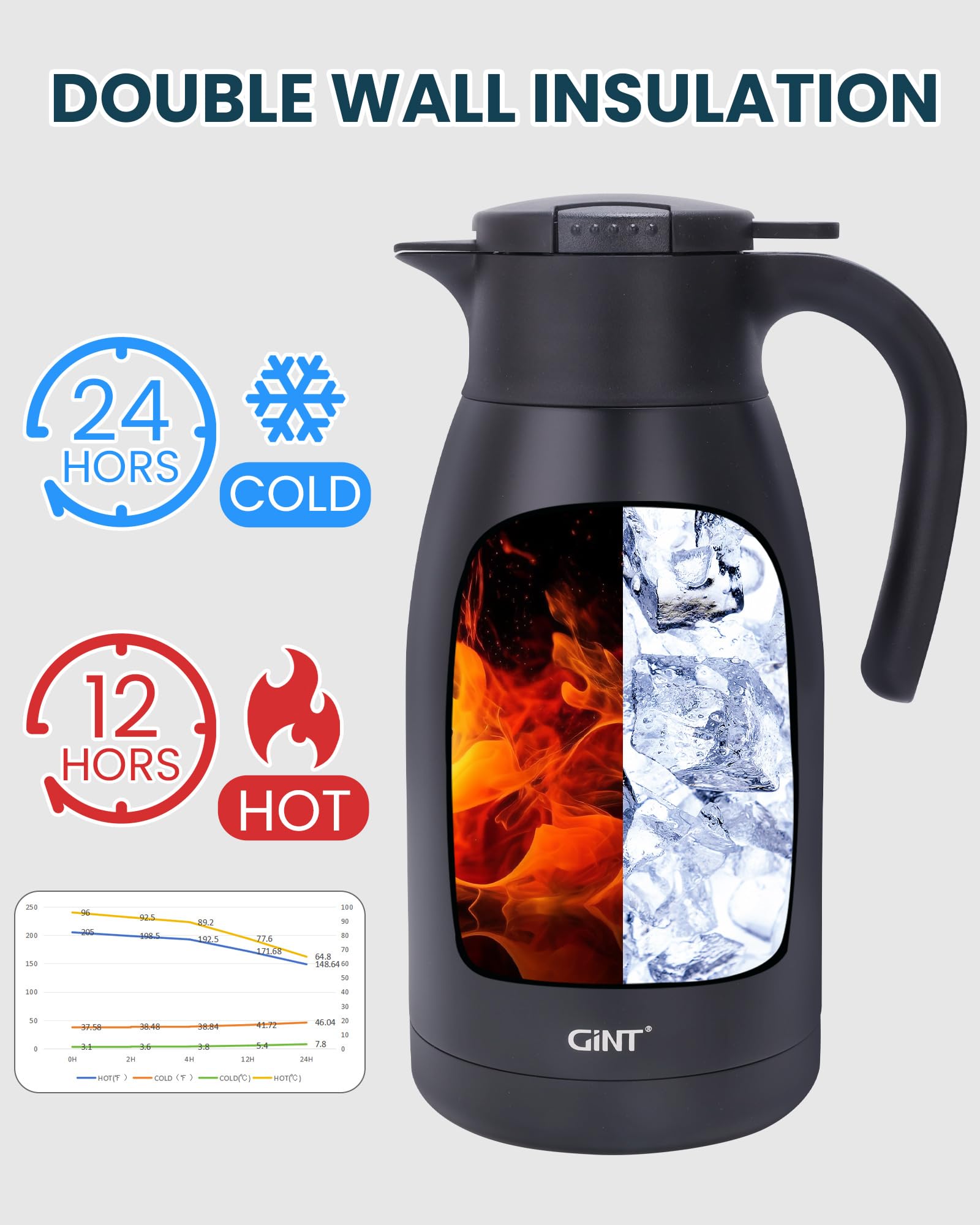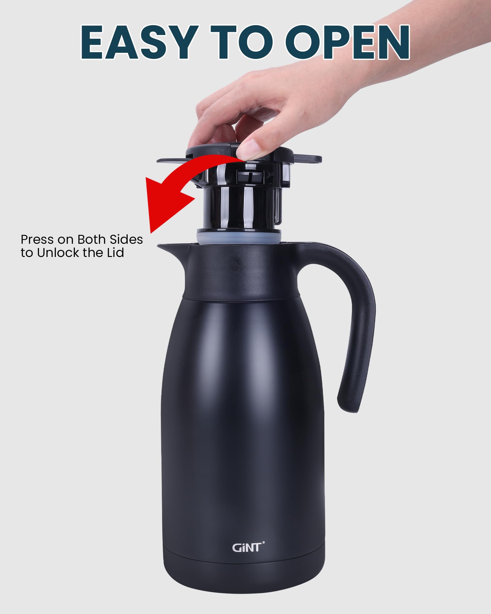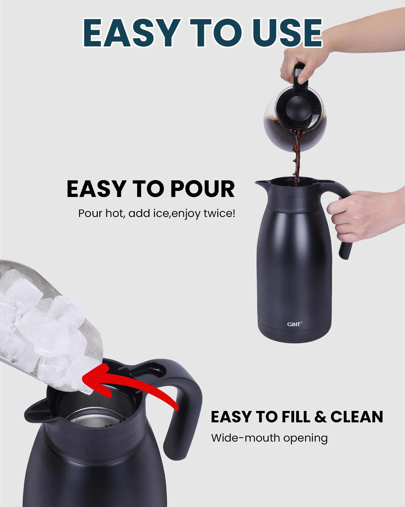 USER FRIENDLY: GiNT 64oz thermal carafe features extra wide top opening, easy for cleaning and adding ice cubes; Simple-push button enables single-hand pouring without leaking, dripping or spilling; Ideal used for bedside, restaurant, office, party, camping, travel insulated coffee carafes.