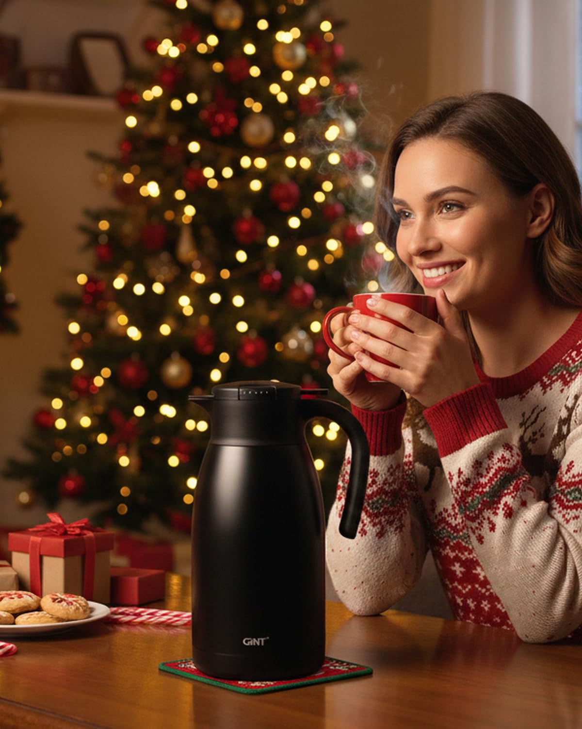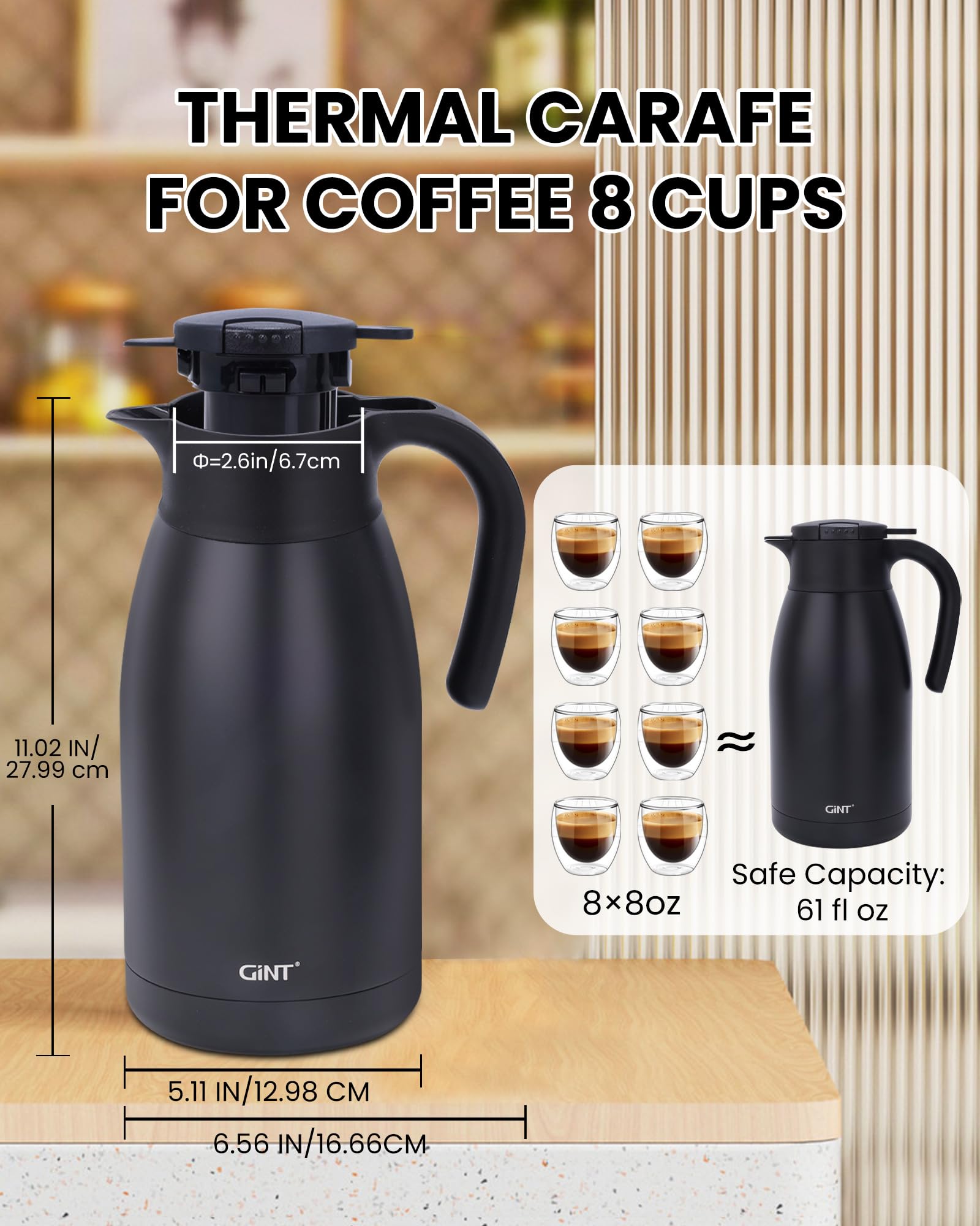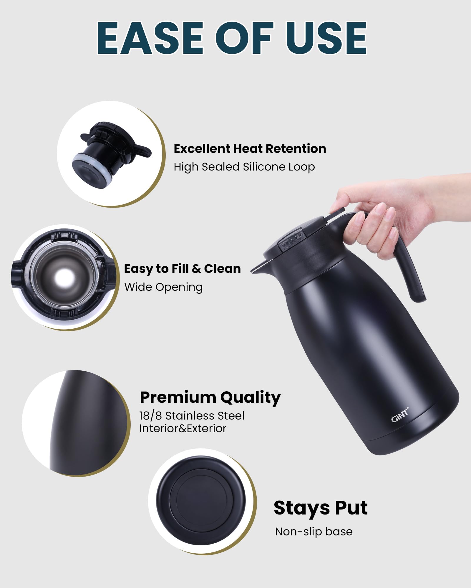 USER FRIENDLY: GiNT 64oz thermal carafe features extra wide top opening, easy for cleaning and adding ice cubes; Simple-push button enables single-hand pouring without leaking, dripping or spilling; Ideal used for bedside, restaurant, office, party, camping, travel insulated coffee carafes.