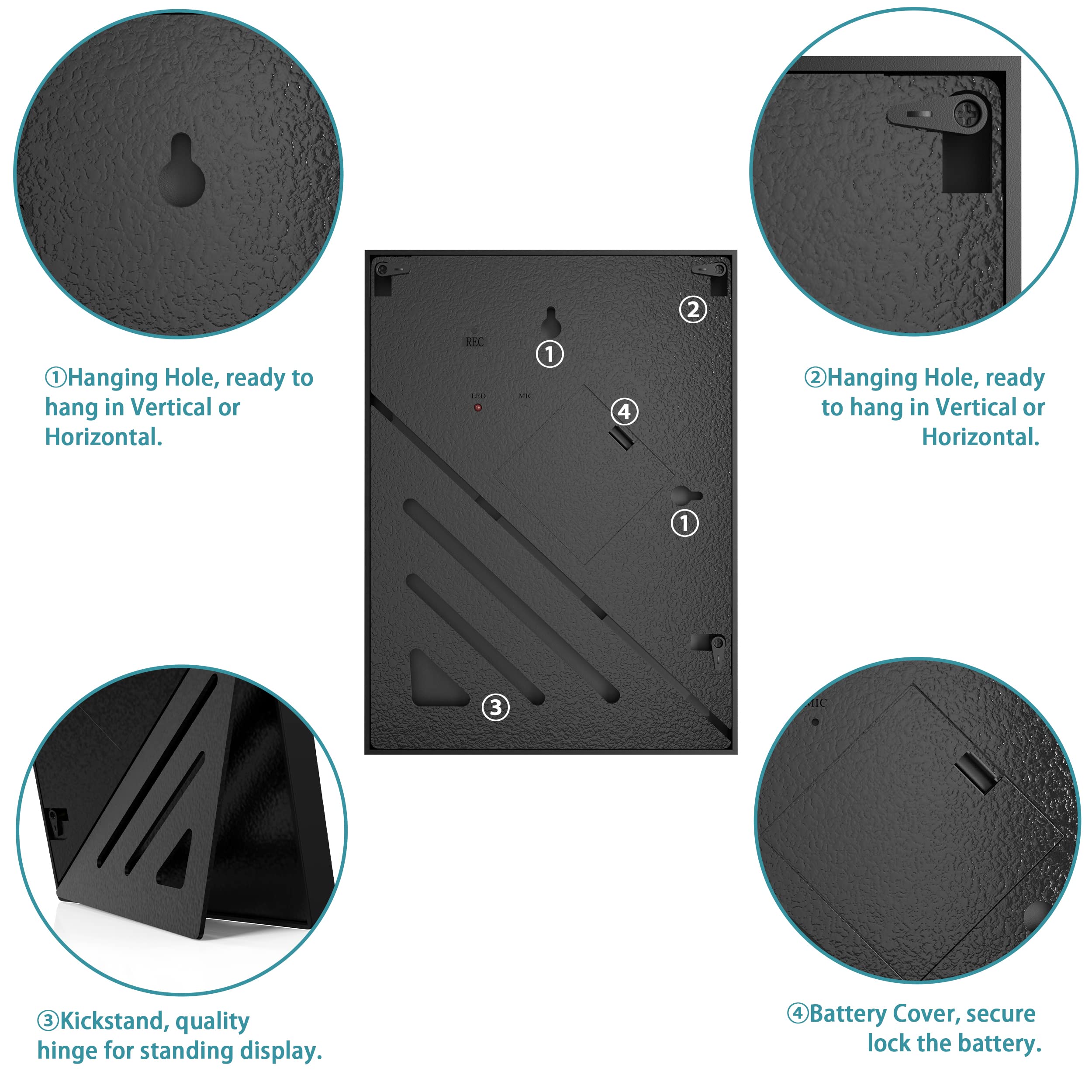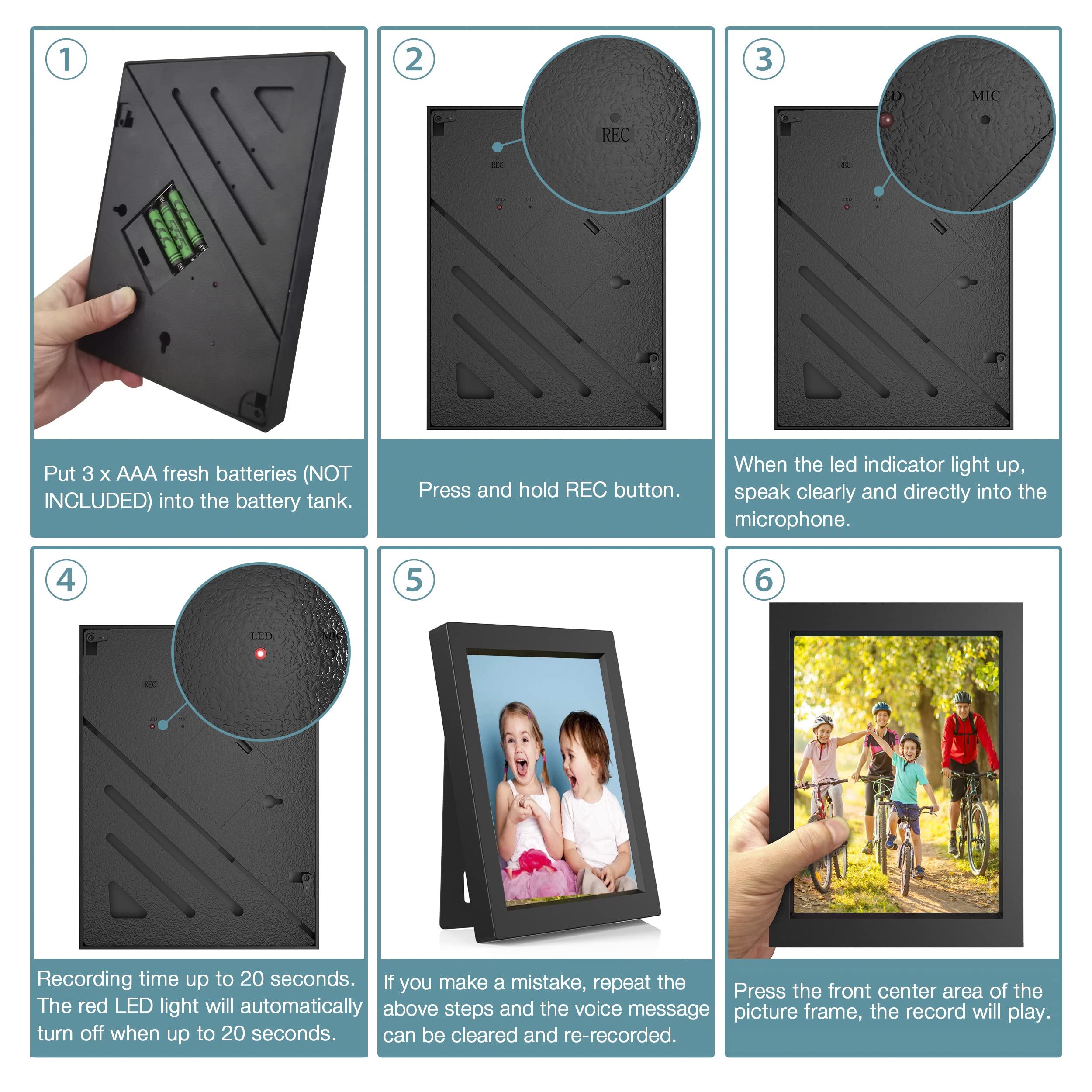 ✨ SIMPLE ONE-TOUCH RECORDING & PLAYBACK – No tech skills needed! Insert 3 AAA batteries (not included), use a pen tip to press and hold the REC button on the back, and speak clearly when the LED lights up. Release to save. Your recording stays safe even when batteries are changed. To hear the message, simply press the front of the frame. It's that easy.
