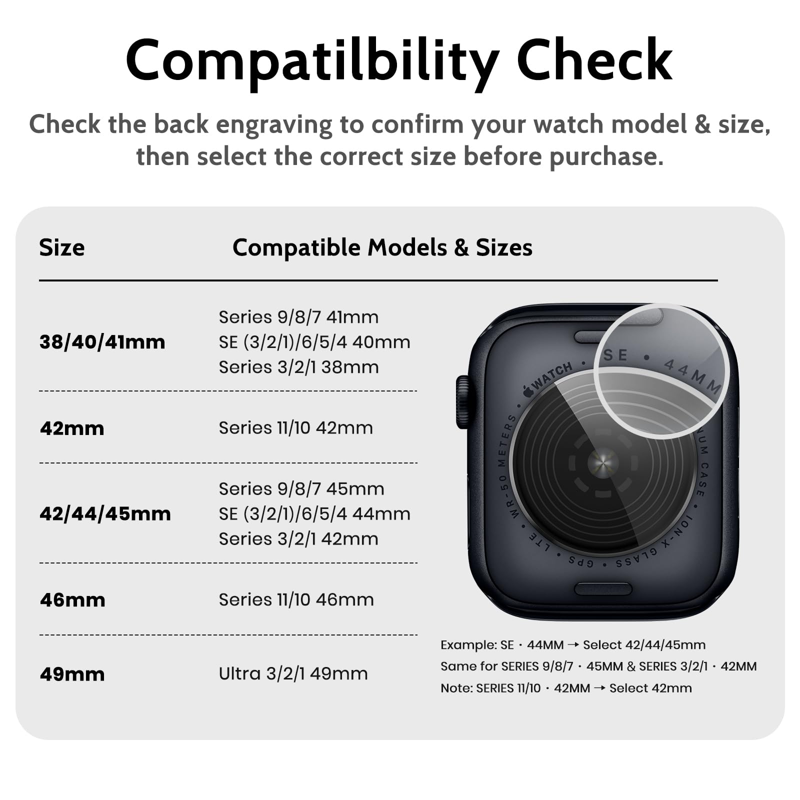 Compatibility & Fit: Compatible with Apple Watch series 9/8/7 (45mm), SE (3/2/1)/6/5/4 (44mm), and 3/2/1 (42mm). Adjustable strap fits most wrists 145-220mm (5.7" - 8.7").
