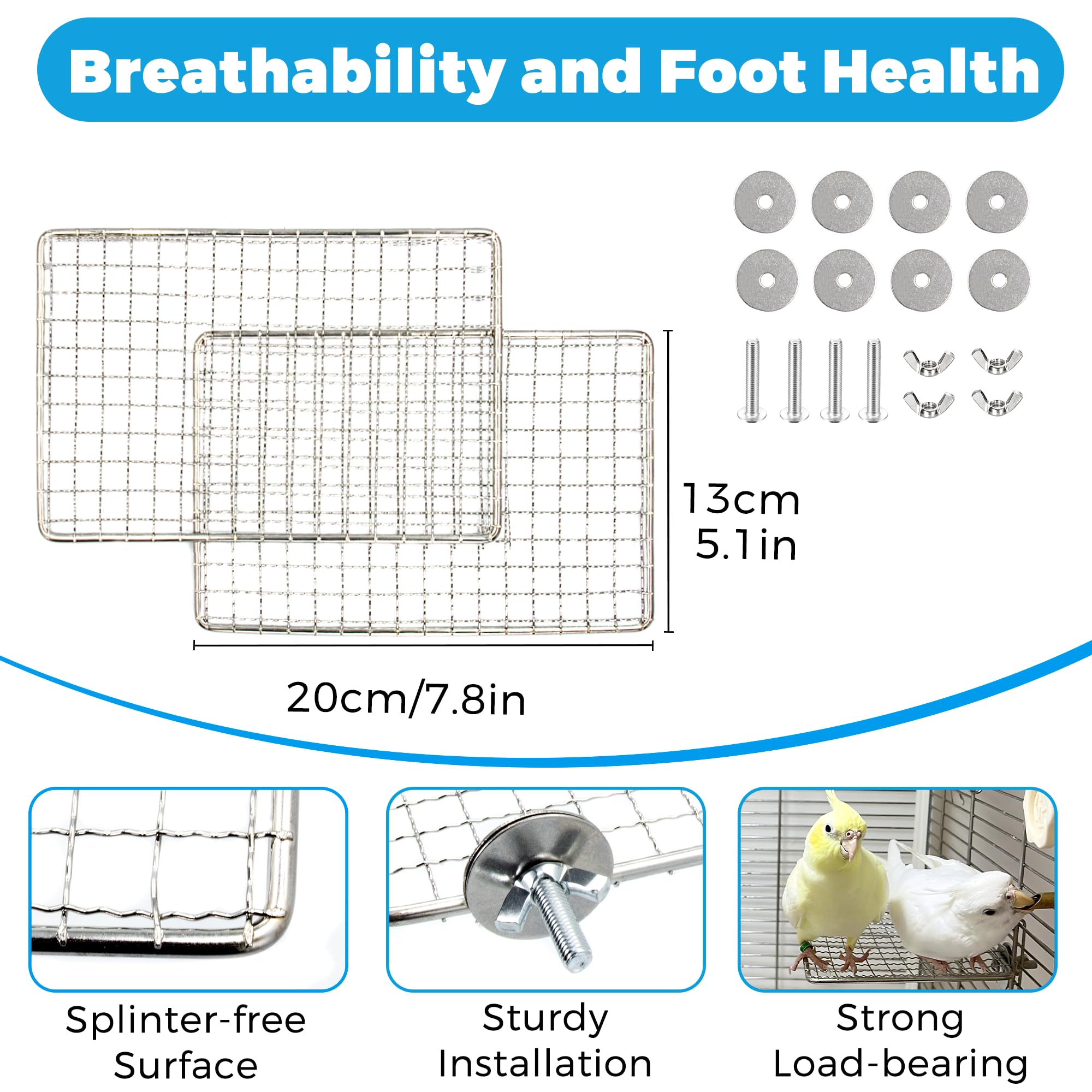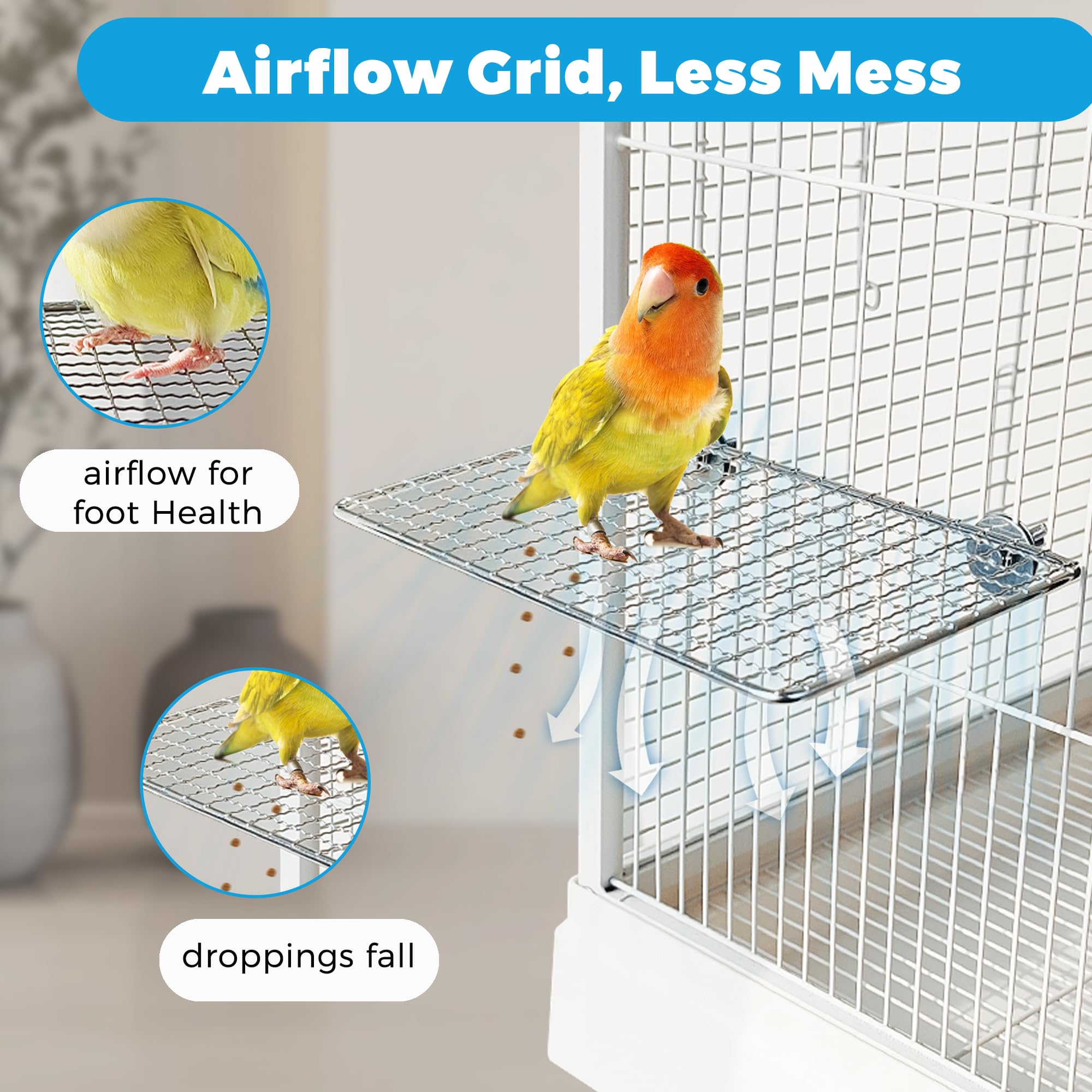 Airflow and Droppings Self-Removing: The open-grid bird cage platform enhances airflow to prevent heat buildup, keeping parrots or cockatiels foot health. Meanwhile the bird droppings will fall through the grid, reducing cleaning frequency