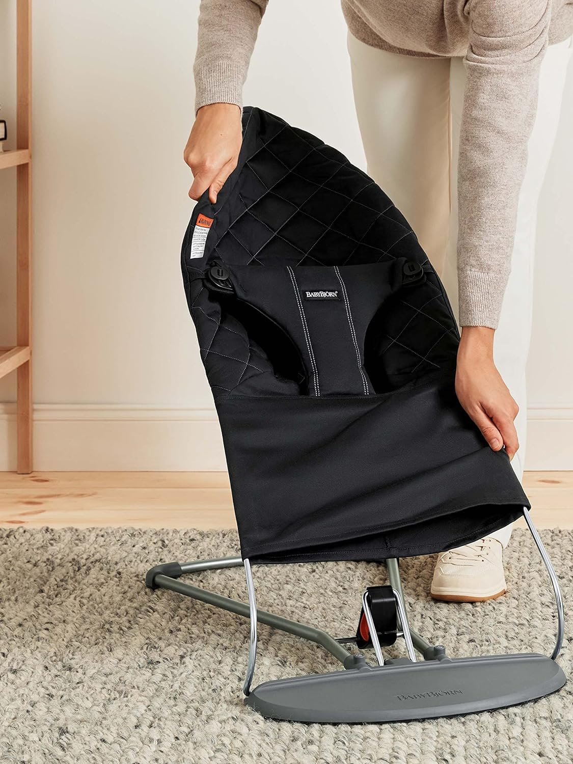You can use the product as a bouncer until your child weighs 20 lbs or starts trying to sit up. Remember to keep your baby under constant supervision, use the safety harness and double-check that the snaps are locked (you can choose between two positions) when using the product as a baby bouncer. When your child has learned to walk and sit down unaided, simply turn the fabric seat around and use the product as a comfy children’s chair. You can use it as a chair until your child weighs 29 lbs.