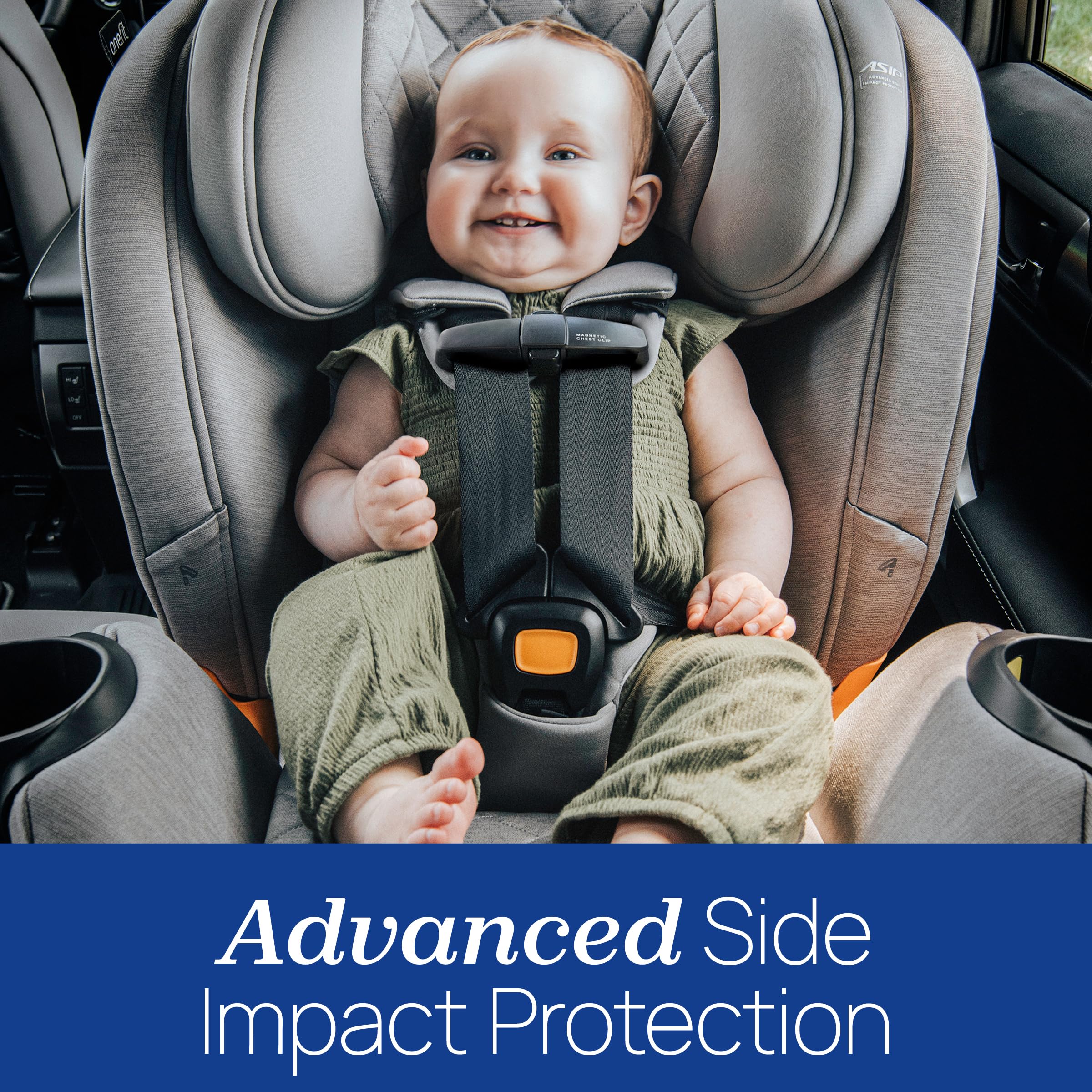 MAXIMIZED FIT AND COMFORT – Convertible car seat features 20% more rear-facing legroom (compared to other OneFit car seats) and the widest range of headrest height adjustment. Featuring Advanced Side Impact Protection (ASIP), OneFit Max is engineered to meet the Federal Motor Vehicle Safety Standard FMVSS 213a – Side Impact.