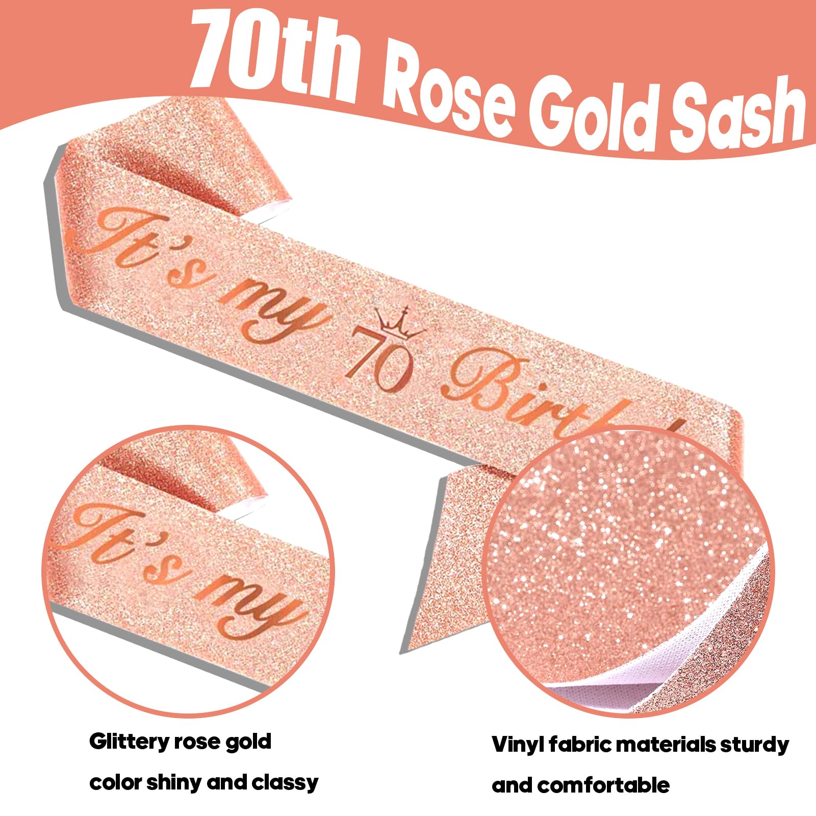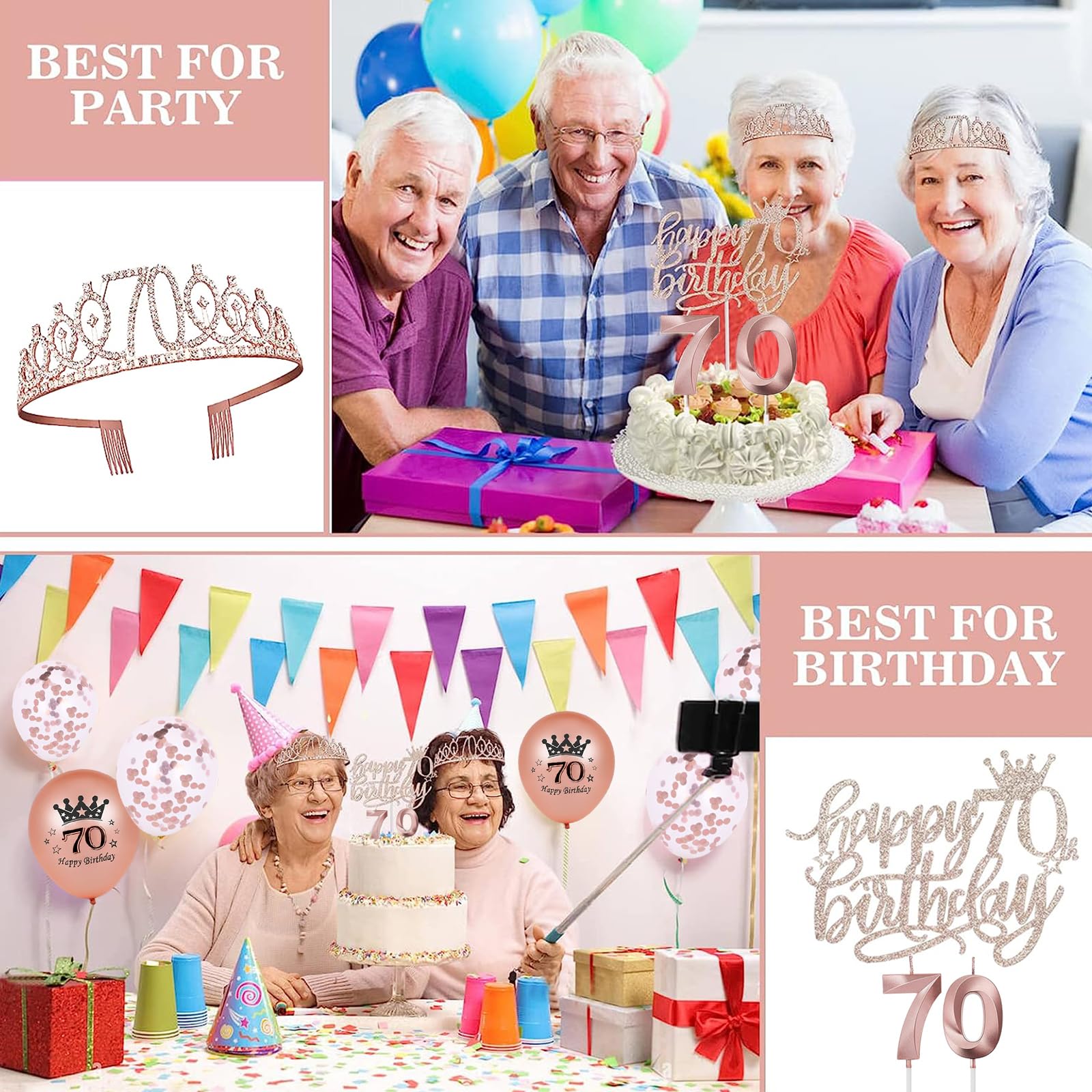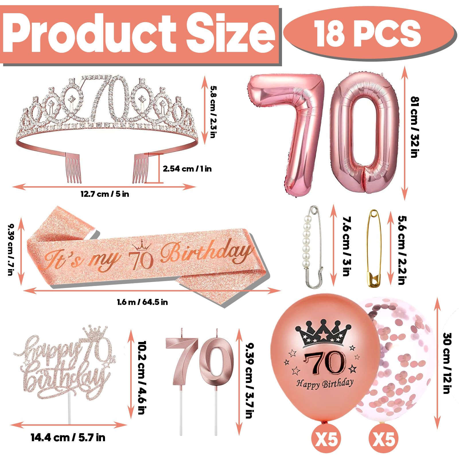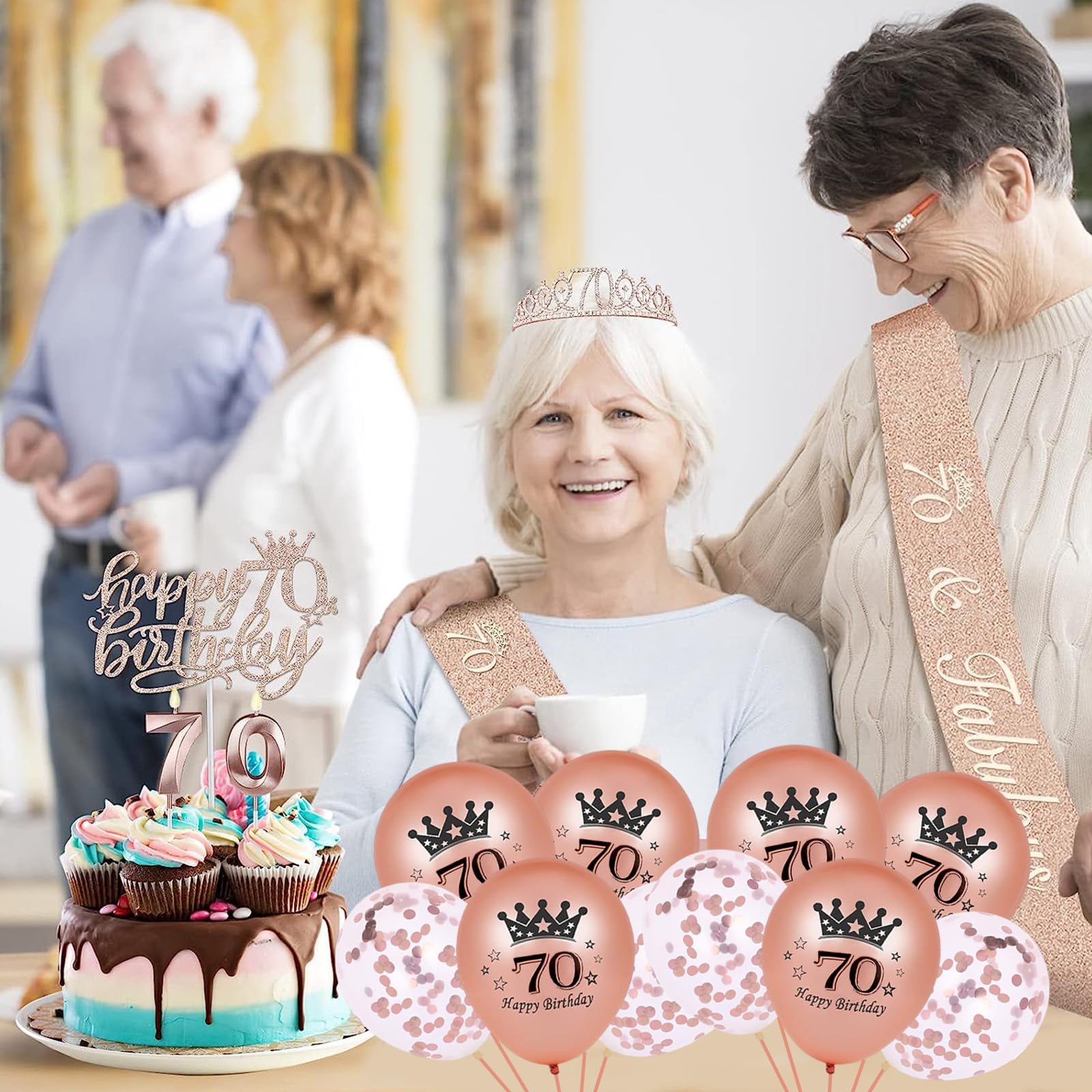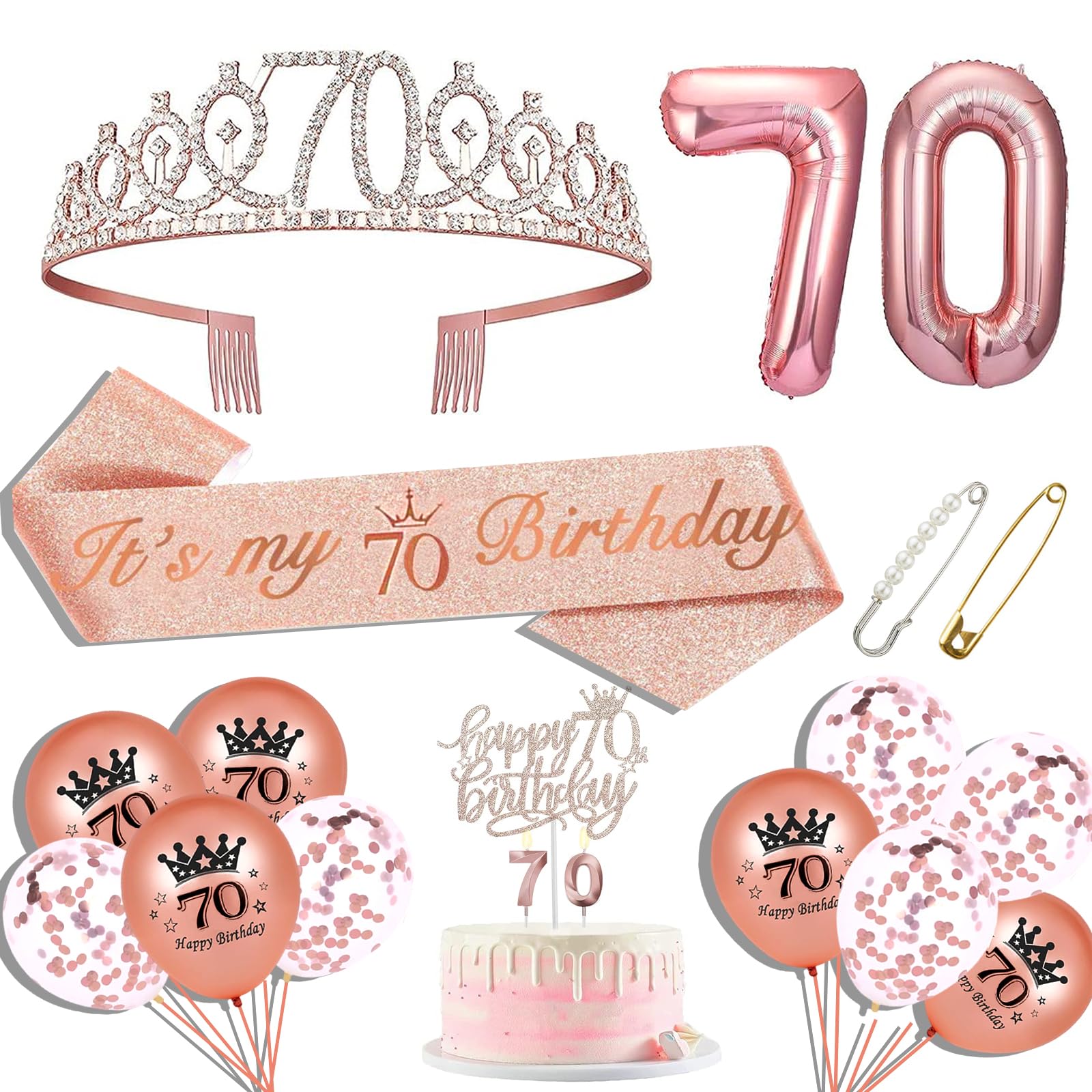 γ70th Birthday Decorationsγ: Package coming with rose gold 70 birthday crown 1pc, 70 birthday sash 1pc, 70th birthday balloons 12pcs, happy 70th birthday cake topper 1pc, 70th birthday candles, This Birthday Gifts for women remind her and everyone in the 70th birthday party how fabulous she is.