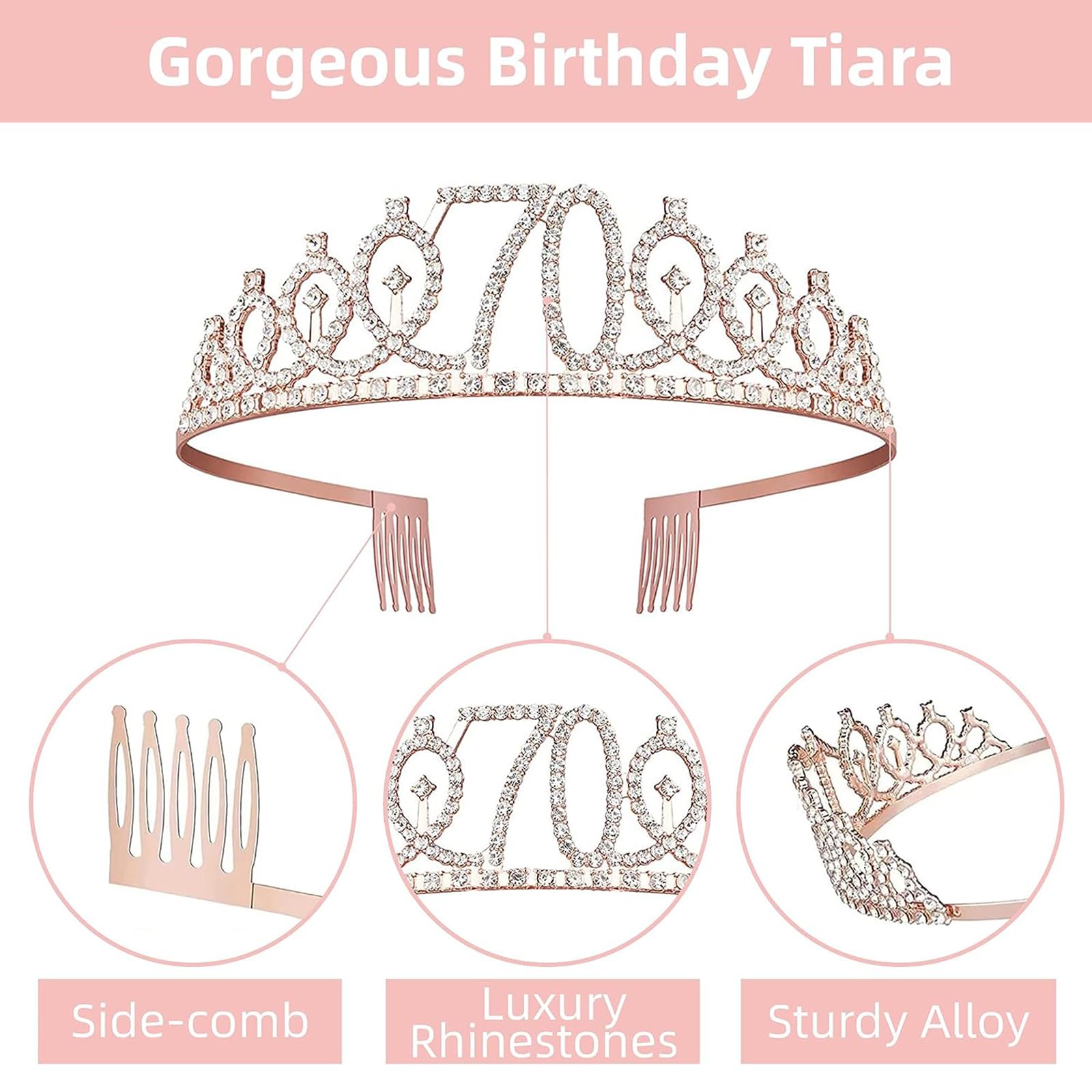 γ70th Birthday Tiaraγ: The 70th birthday crown headband is made of quality alloy and shiny rhinestones, rose gold color highlights elegance. Crown with combs that make sure it can grip the hair more tightly for fitting girls.