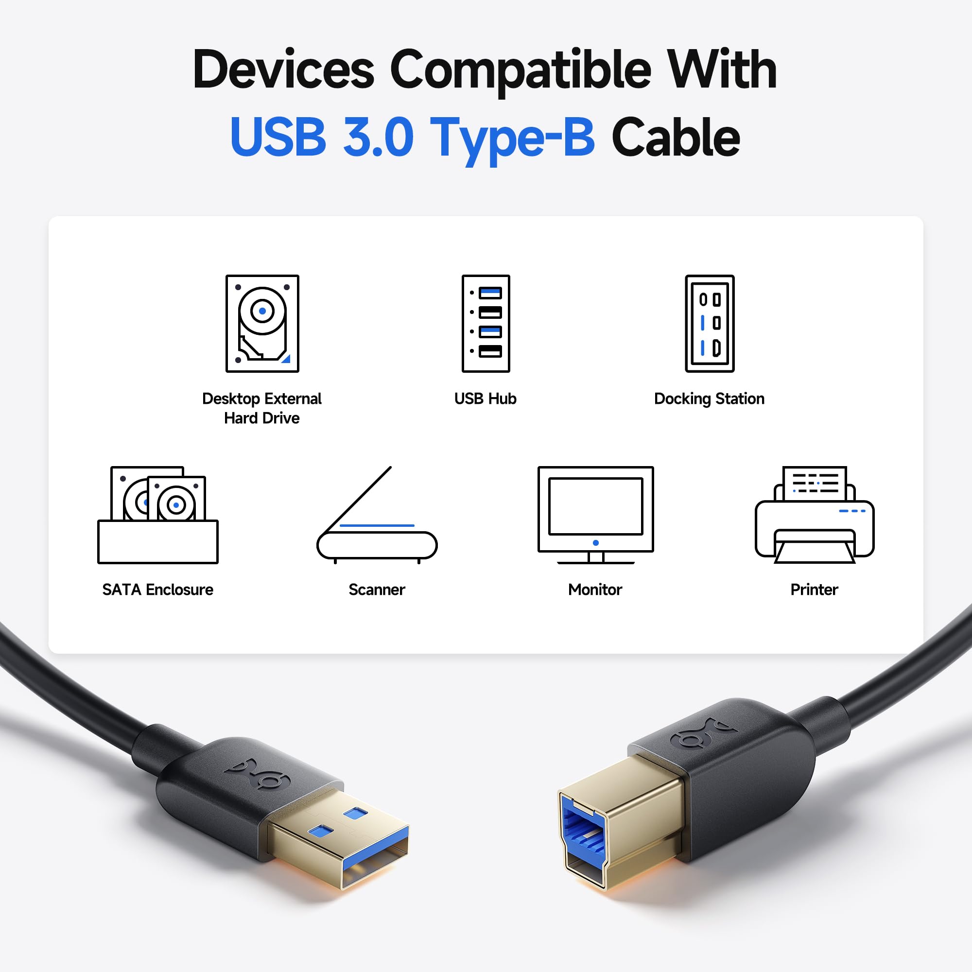 Broad Compatibility with Popular Devices: The USB 3.0 Type B cable is compatible with Fujitsu ScanSnap iX500 scanner, Dell S2340T monitor, Dell USB 3.0 docking station, HP USB 3.0 port replicator, and Western Digital (WD) and Seagate desktop USB 3.0 external hard drives equipped with a Type-B USB 3.0 port.