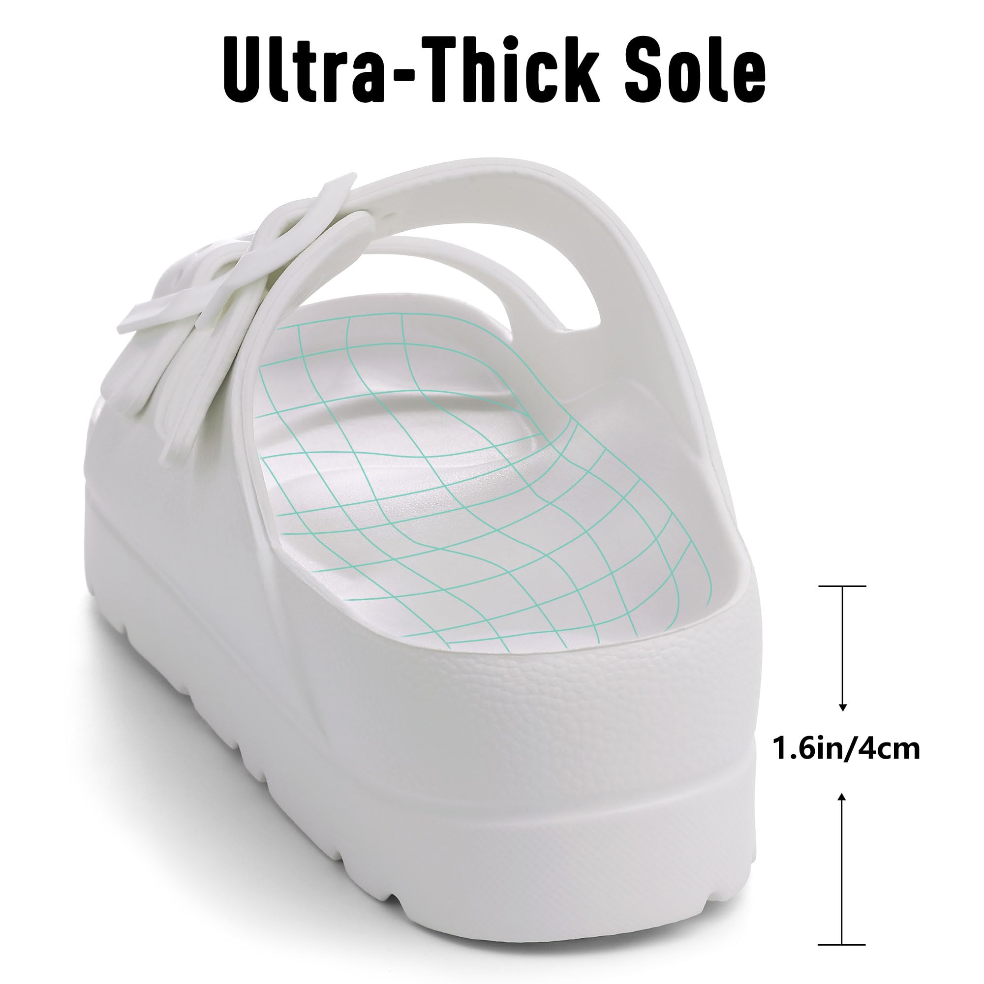 【Excellent Cushioning】1.6 inch supper thick sole is made of premium and durable EVA material, bouncy slightly rubbery feel, enhancing stable and cushioning performance, just like walking on clouds or marshmallows.