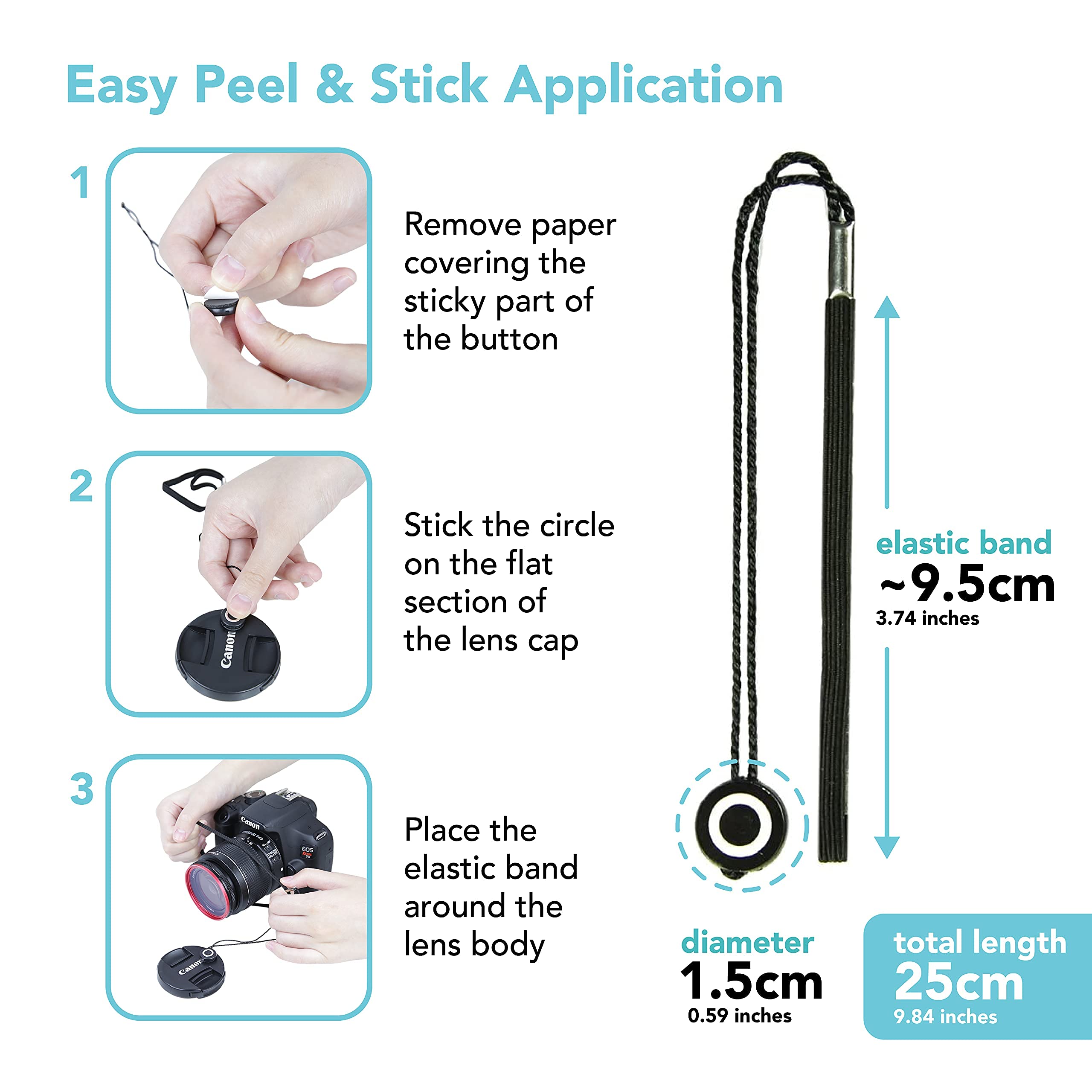 Peel-n-stick application. The DSLR lens cap holder with string is easy to use. It has a small button with strong adhesive back that sticks securely onto the front of your lens cap. Sticker button diameter: ~1.5cm/0.59in.